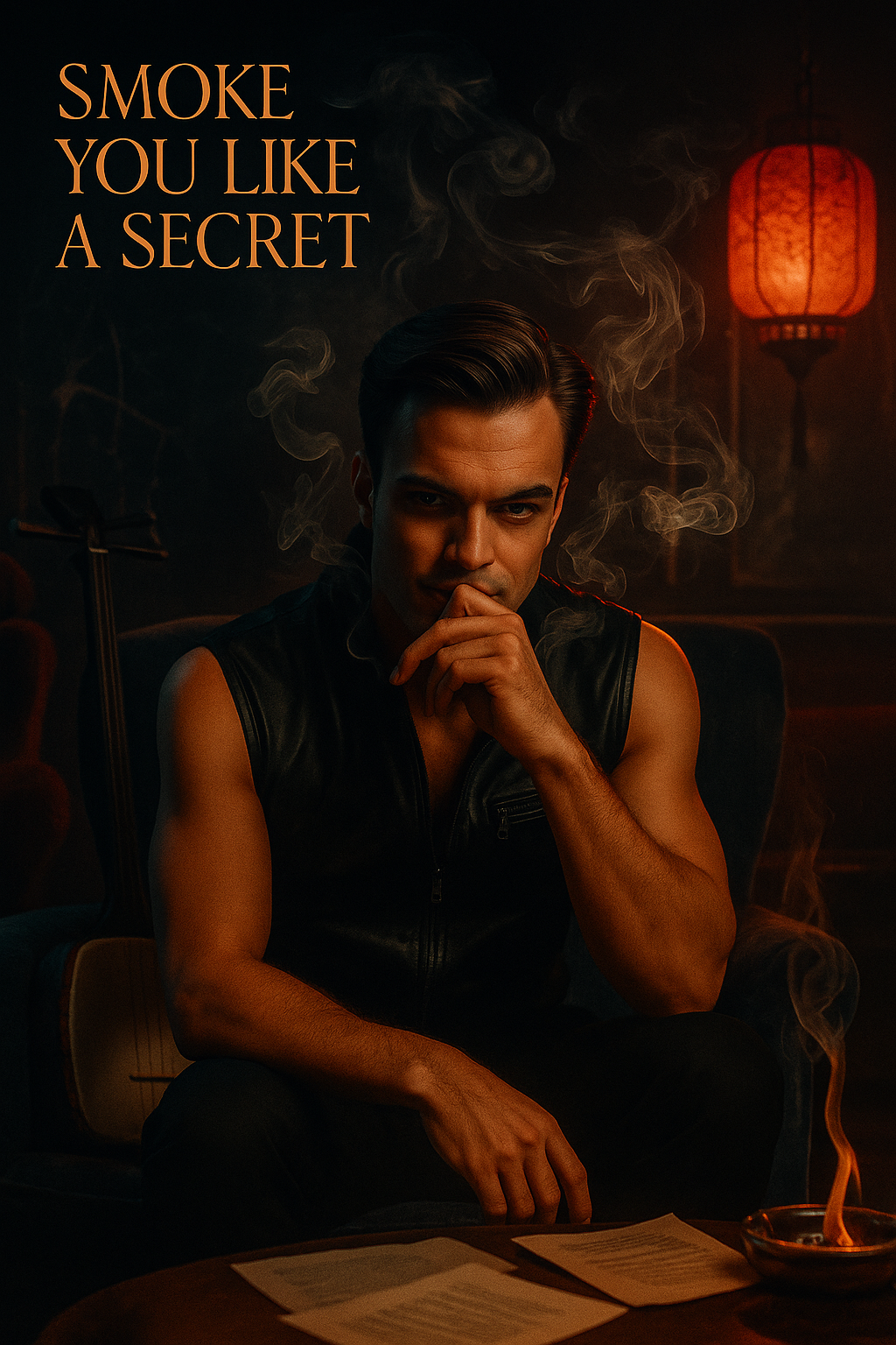 Dark, cinematic post-rock at 96 bpm, deep bass-driven groove, distorted electric guitars with ambient delay, shamisen melodies weaving through the mix, sultry and moody atmosphere, Focus on deep male vocals with a gruff, amused tone – blending seduction, obsession, and slow-burning passion, Subtle trip-hop-inspired drums, sparse piano accents, low-frequency rumble, Layers build slowly toward hypnotic climaxes, Inspired by fire, smoke, and shadows
