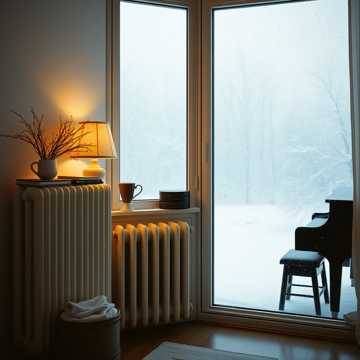 Refined neo-classical / chamber-pop, 78–84 BPM, intimate winter, Core: acoustic piano + string quartet (piano backbone), warm room reverb, controlled dynamics (NO epic swell), Add subtle metronomic click/clack (radiator/kettle/clock), soft & elegant, No trap/EDM; if percussion, only tiny brushes/finger taps, very light, Lots of space/quiet details; NO big build, NO chorus lift; steady emotional level, bittersweet but comforting, VOCAL: Female lead only, cute clean “seiso”, close-mic, soft sincere, minimal vibrato, NO belting/shouting/rap, clear English diction, THEME: heavy snow outside / warm home inside (coffee, heater hum, window whiteout, dinner), “snow is normal” as calm prayer, RULES: Chorus lines repeat EXACTLY, Keep melody stable; no ad-lib runs, Optional instrumental break 16–32 bars: piano motif + strings only, NO new section, Quiet ending with small piano figure, PASTE LYRICS BELOW: