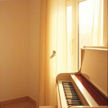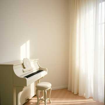 FEMALE LEAD ONLY, soft clear cute female vocal, intimate close-mic, gentle clean Japanese diction, light natural phrasing, minimal vibrato, no vocal acrobatics, delicate chamber-pop / soft whimsical pop, around 84–92 BPM, 4/4, bright indoor afternoon atmosphere, elegant and tender, cute but not childish, acoustic piano in the foreground, very soft brushed drums or tiny light percussion, subtle upright bass or soft rounded low end, very light strings for warmth, faint glockenspiel or celesta-like sparkles used sparingly, airy and graceful, small natural motion, no big build, no dramatic climax, no EDM, no heavy drums, no rock guitars, no dense synth layers, keep the arrangement transparent and charming, verses intimate and flowing, chorus slightly wider but still soft and restrained, preserve a feeling of sunlight, curtain movement, and a small white presence in the room, end gently with a soft lingering cadence, hiroshi-wonderful style
