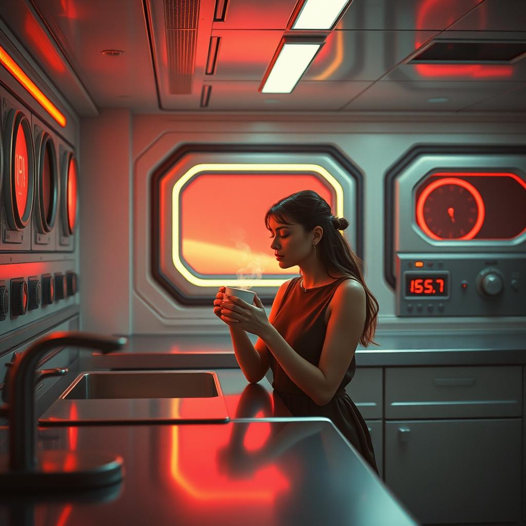 FEMALE lead only, close-mic tired-conversational spoken-sung, behind-beat, 86–92 BPM, Warm minimal Mars-habitat kitchen mood, (Upright piano: few notes) + (thin strings pad) + (warm bass) + (brushed drums / rim), Constant (quiet click/clack) + (faint habitat vent hum / tiny beeps), No build, no chorus lift, Chorus = [NO VOCAL] instrumental refrains only, Piano hook: 3-note sigh loop SAME → half-step↓ → SAME (high→mid→high), no improv, Refrain A (8–16 bars) after V2, Refrain B (16–24 bars) near end same motif + tiny strings swell (still quiet), No male voice, no belting, no ad-libs