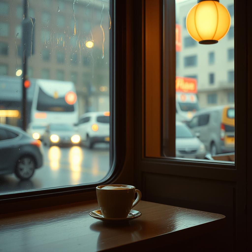 Elegant rainy-city cinematic pop, 92–98 BPM, minor-to-major color (bittersweet but hopeful), soft brushed drums + rim/snare, warm bass, clean guitar arpeggios, gentle piano motif, subtle strings that glow (not dramatic), light ambient rain texture low in mix, NO dystopian/industrial, NO heavy drones, chorus stays intimate (no big build), female seiso vocal close-mic, calm and warm, lyrics about ordinary evenings: umbrella, café, streetlight reflections, small kindness, coming home, Piano: soft felt-like tone, simple repeating motif, gentle attack, lots of space; avoid virtuoso runs