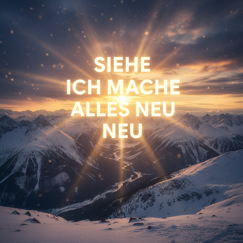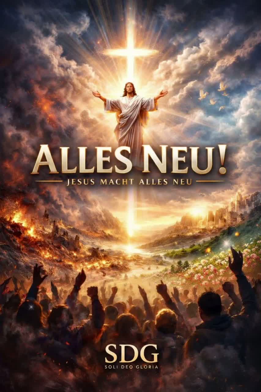 Epic metal anthem with extreme genre-mix: symphonic/orchestral metal + djent breakdowns + folk interlude + church organ and big choir, Tempo ~150 BPM, 4/4, dark-to-triumphant arc, Verses: aggressive growls with tight modern riffing; pre-chorus lifts with melodic lead; chorus: massive clean vocals with choir support, hook centered on “Siehe, ich mache alles neu”, Bridge: cathedral organ + chant-like choir, then drop into crushing breakdown call-and-response, Include a soaring guitar solo after the folk interlude, Huge cinematic drums, wide guitars, but clear vocals, No synth-pop, no cheesy glam