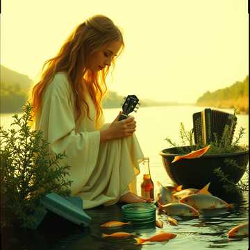 Joyful Spanish folk metal Christmas hymn sung entirely in Spanish celebrating fish drinking from the river to witness God's birth, Opens with flowing acoustic guitar and Mediterranean mandolin evoking water before building into energetic folk metal, Features playful vocals alternating between tender verses about Mary and exuberant choruses about drinking fish, Castanets and palmas create rhythmic drive while accordion adds festive warmth, Recurring chorus swells with celebratory choirs and dancing melodies, Verses paint intimate scenes of the Virgin with golden hair washing clothes by rosemary while angels sing, Dynamic shifts mirror whimsical joy of nature responding to Christ's birth, Flamenco guitar flourishes blend with metal riffs, The song maintains lighthearted wonder throughout, capturing innocent delight of creation celebrating incarnation, Mediterranean instruments and Spanish traditions merge with symphonic energy
