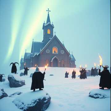 Epic Icelandic Viking metal hymn sung entirely in Icelandic with authentic Nordic instrumentation, Opens with Arctic winds and langspil before exploding into folk metal, Features rímur vocal style and kulning throat singing over crushing guitars, Fiðla melodies weave through arrangements while lur horns announce the holy season, Powerful vocals channel ancient sagas capturing northern winter and sacred festivities, Communities lighting pure flames as helgum tíðum approaches, War drums mirror volcanic power while strings evoke norðurljós across black skies, Medieval þjóðlög traditions meet metal brutality, Goat horns add primal atmosphere, Dynamic builds from contemplative eddic poetry to triumphant finale, Combines pagan æsir reverence with Christian celebration, Icelandic consonant beauty emphasized through skaldic delivery honoring saga heritage with symphonic power