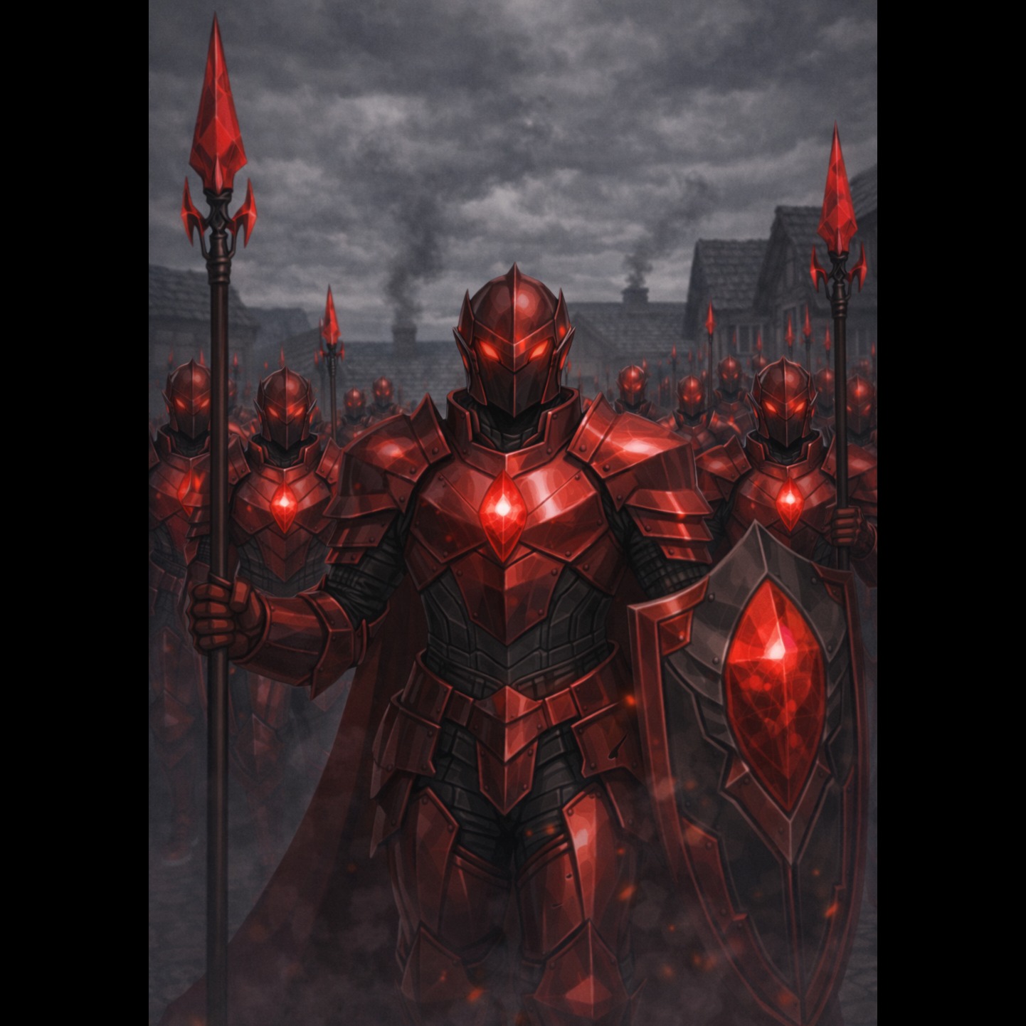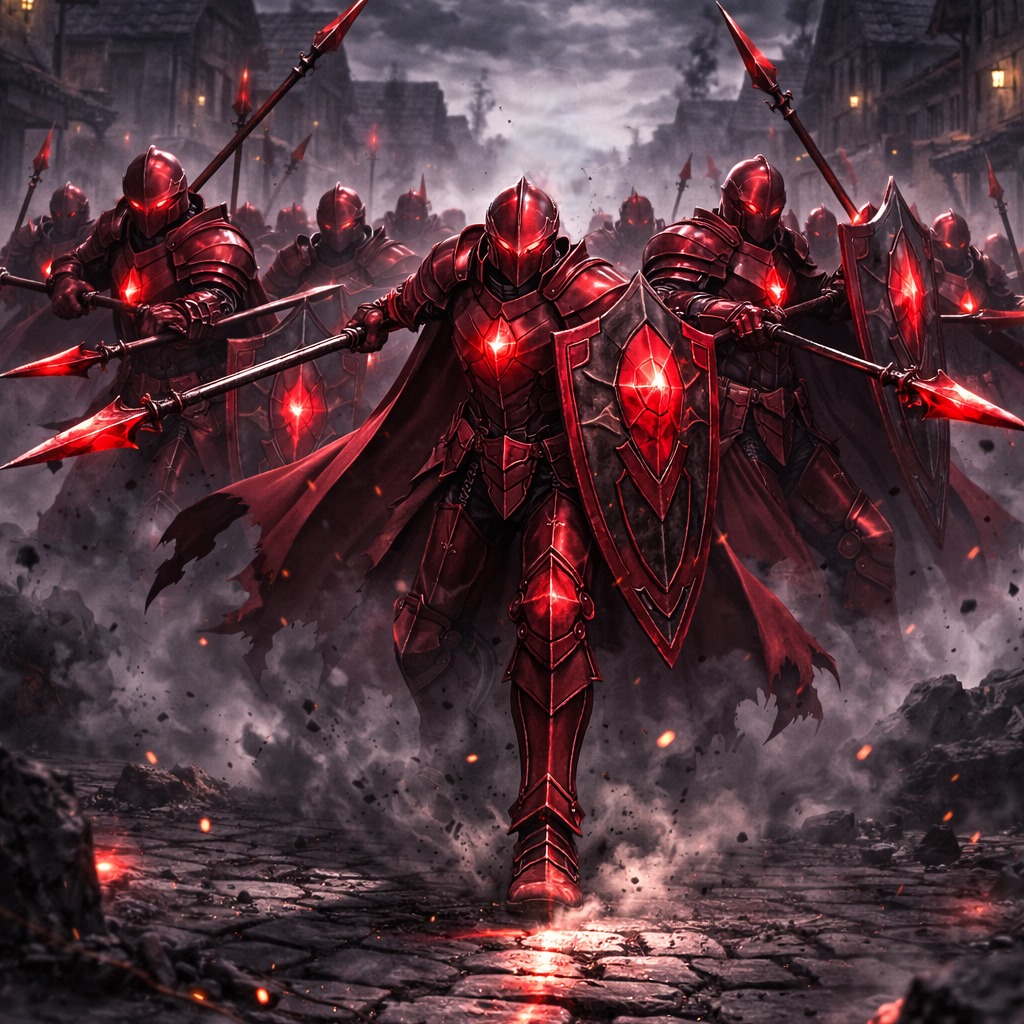 Dark phonk battle theme, distorted cowbells, heavy bass, aggressive drums, male semi-rap vocals with Spanish + Japanese lines, cinematic anime fight vibe, knights in red armor vs rune magic, intense energy