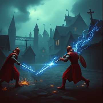 Epic anime orchestral electro battle duet, male and female vocals, dramatic fantasy fight, glowing blue runes vs red armor knights, cinematic choir, emotional sacrifice, powerful climax, heroic vibe