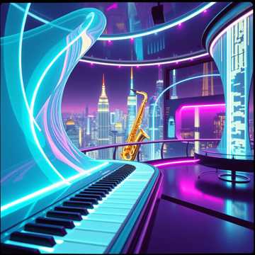 **Style / Genre:** Future Cyber Jazz — advanced jazz harmony fused with futuristic synth textures, glitch rhythms, and AI-generated improvisation, Sounds like a space station jazz club in the year 2367, **Instrumentation:** holographic piano, quantum upright bass, brushed electro-drums, warm analog sax synth lead, subtle ambient pads and data-glitch textures, **Harmony / Melody:** complex jazz chords, extended harmonies, modal shifts, futuristic scales, improvisational solos processed through subtle digital modulation, **Rhythm:** smooth swing blended with cybernetic micro-grooves and soft glitch percussion; flowing but controlled tempo, **Structure:** atmospheric intro, evolving improvisation sections, layered cyber textures, luminous floating outro, Sound Design: Dolby Atmos, surround sound effects, deep 3D stereo field, spatial echoes, soft holographic reverb tails, gentle digital shimmer, immersive futuristic ambience while