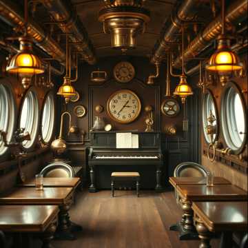 **Style / Genre:** Retro Steampunk Jazz — classic 1920s swing blended with mechanical steam-era atmosphere, **Instrumentation:** upright piano, muted trumpet, clarinet or saxophone, upright bass, brushed drums, subtle mechanical percussion (clock ticks, steam valves, gear clicks), **Mood:** warm vintage café inside an airship engine room; nostalgic, playful, slightly mysterious, **Harmony / Rhythm:** traditional jazz swing groove, simple but elegant chord progressions, expressive solos with old-record charm, **Sound Design:** Dolby Atmos, surround sound effects, wide stereo field, soft tape saturation, gramophone-style texture, gentle steam hiss, metallic resonance, echoing reverb for immersive steampunk ambience, **Structure:** short intro → lively swing section → solo improvisation → calm vintage fade-out