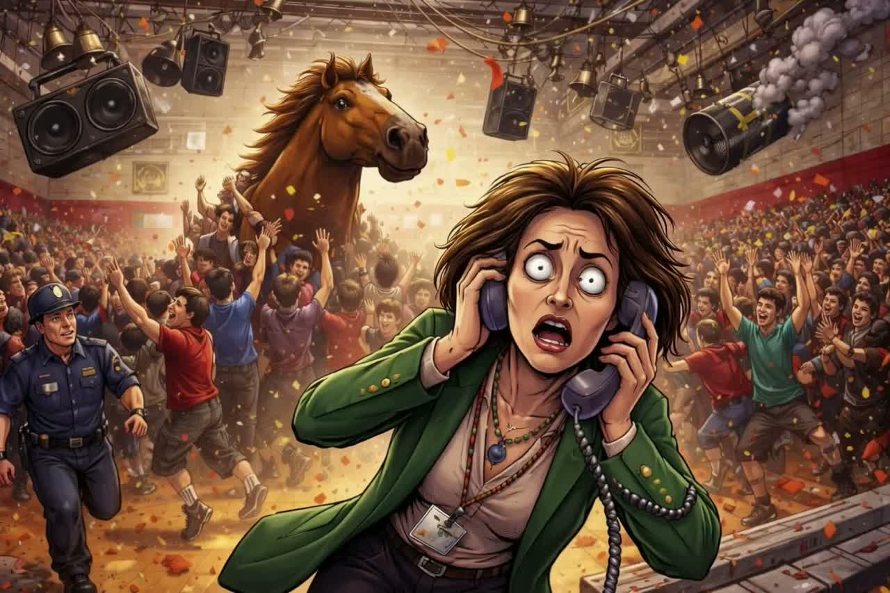 Electro House, Big Room, Hyperpop, High-NRG, Club Anthem, A fast-paced, aggressive dance-floor track with distorted basslines, crowd chant call-and-response, glitchy vocal chops, and chaotic energy reminiscent of over-the-top pep rallies and absurd satire, The beat is stomping and synthetic, layered with anthemic synths and percussive buildups that mimic the energy of cheer squads and dance-offs, The track uses punchy 4/4 rhythms, glitch textures, warped samples, and stadium-level drops, It's intentionally bizarre, bold, and off-kilter, designed for dramatic choreography and crowd interaction, Great for remix potential, memeable segments, and TikTok-ready viral moments, ‑Lo-fi, ‑Acoustic Singer-Songwriter, ‑Chillwave, ‑Classical Ballad, ‑Minimal Techno