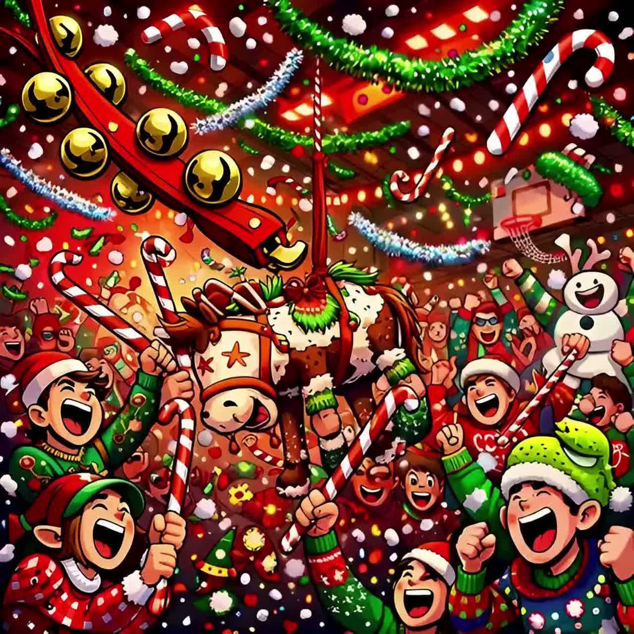 A loud, high-energy holiday remix built around chant vocals, pounding rhythm, sleigh bells, distorted festive percussion, and exaggerated school-rally momentum, The track blends Christmas textures with absurd escalation, favoring repetition, crowd energy, and playful chaos over melody or restraint, ‑soft christmas, ‑traditional carol, ‑acoustic, ‑jazz, ‑orchestral, ‑ambient, ‑worship