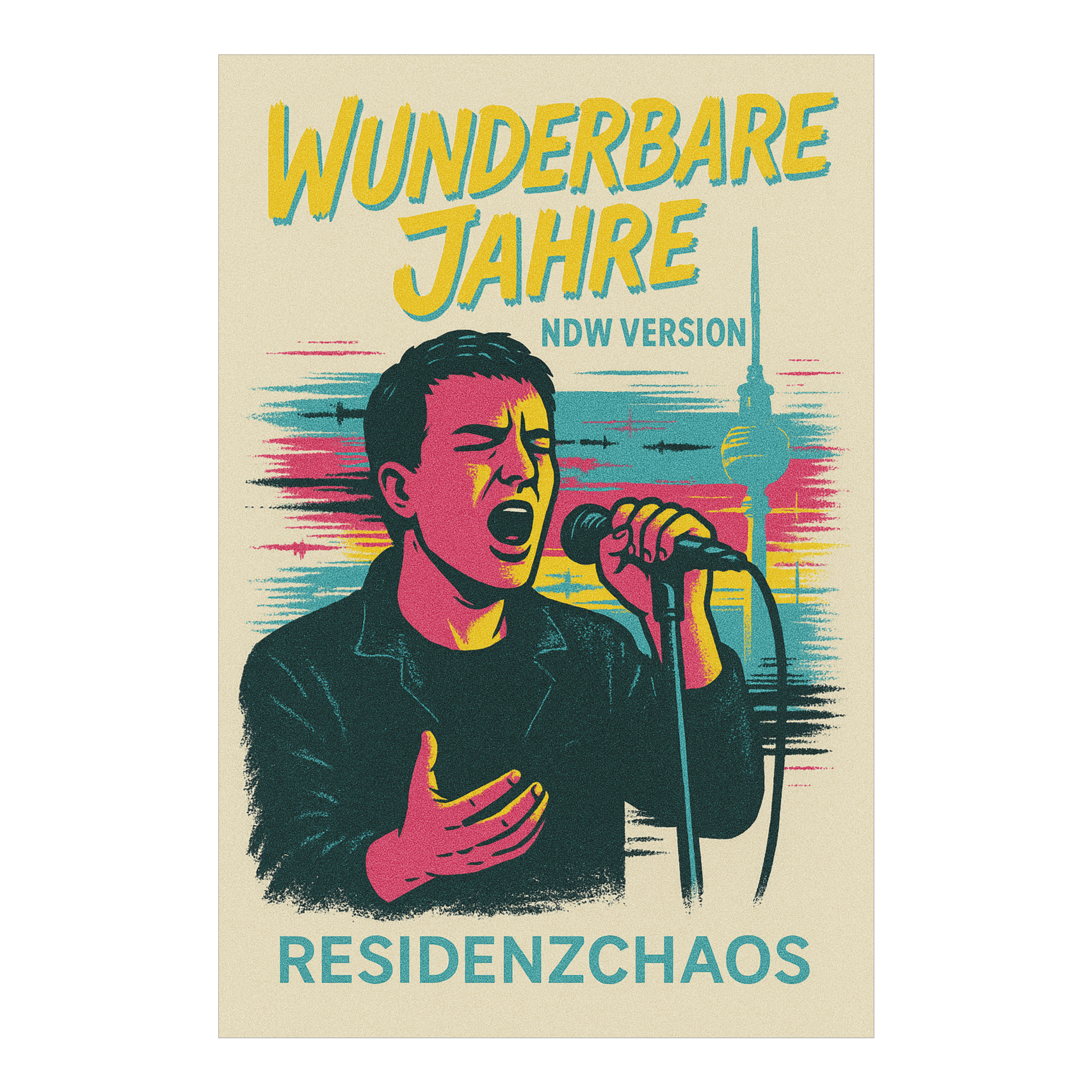 A Neue Deutsche Welle track with punchy TR-808-style drums, analog synth stabs, robotic arpeggios, and pulsing bass anchors the groove, Verses are stark and rhythmic, while choruses burst into bright, layered synths and clipped harmonies, Minimalist, melodic hooks keep it catchy and playful, ear-catching, hit potential, perfect mix and mastered, chart storming track