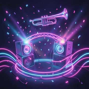 A high-energy EDM hardstyle track at 150 BPM features pounding kick drums and trumpets, Energetic early‑2000s track with a driving 4‑on‑the‑floor beat, gritty and distorted synth‑bass, heavy sidechain compression, sharp digital synth stabs, futuristic vocoder‑style vocals, mechanical rhythmic elements, minimal but powerful melodic riffs, dark club atmosphere, punchy drums, and a tight, groovy, robotic groove