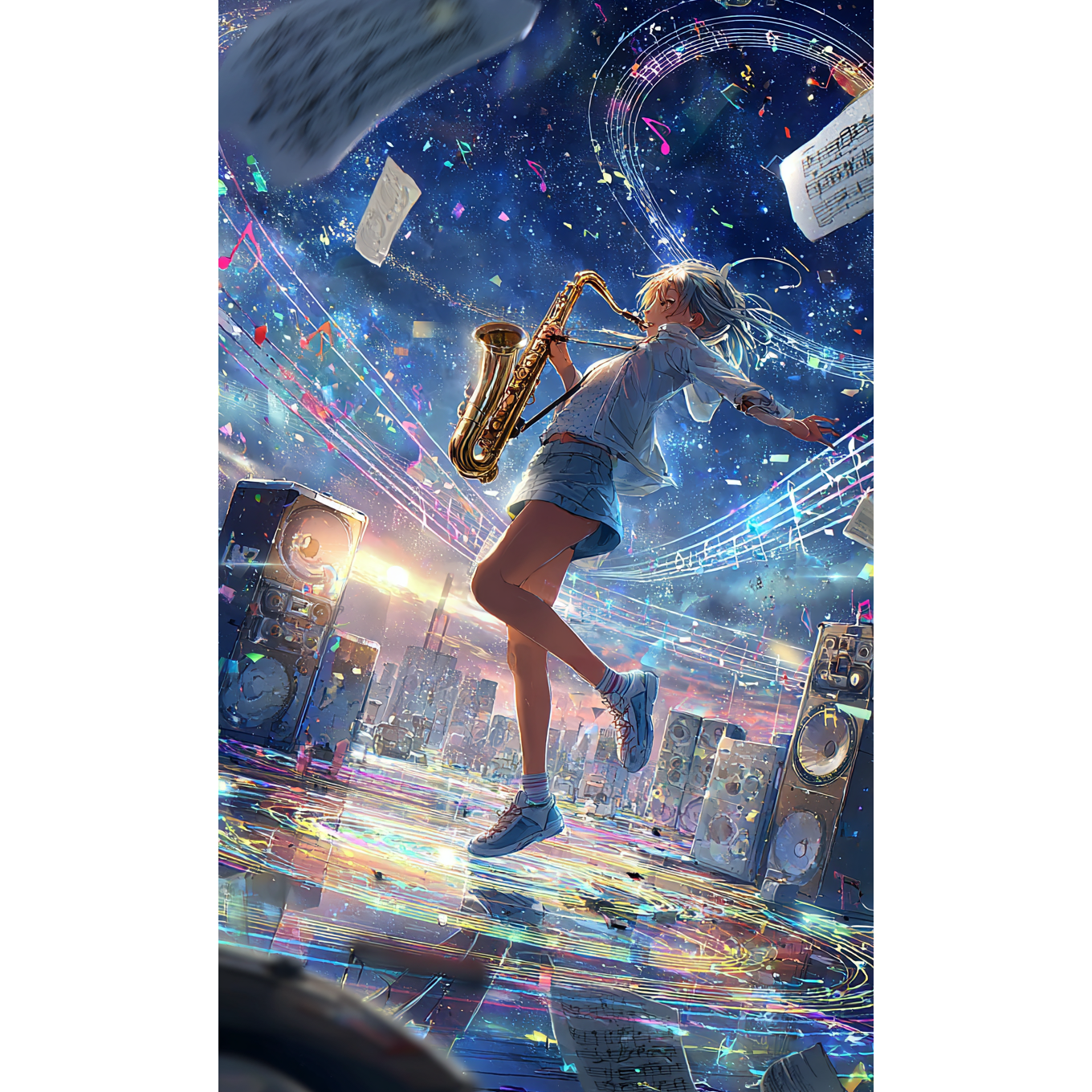 Funky Pop, Jazz-Pop, Electro Swing, BPM 128–135, Bright synths, slap bass, jazzy brass hits, retro-futuristic FX, crisp dance beats, High-energy anime-style pop with big-band jazz flavor, Verses feature bouncy rhythms and catchy phrasing; choruses explode with swing-infused melodies and layered harmonies, Bridge includes bold sax solos and rhythmic breakdowns, Designed to feel like a cosmic stage show with vivid visuals and danceable groove, Ideal for animated rhythm games, space-themed idol concerts, or energetic pop showcases, Female or playful vocals, flashy and vibrant vibe, groove-heavy, and fun