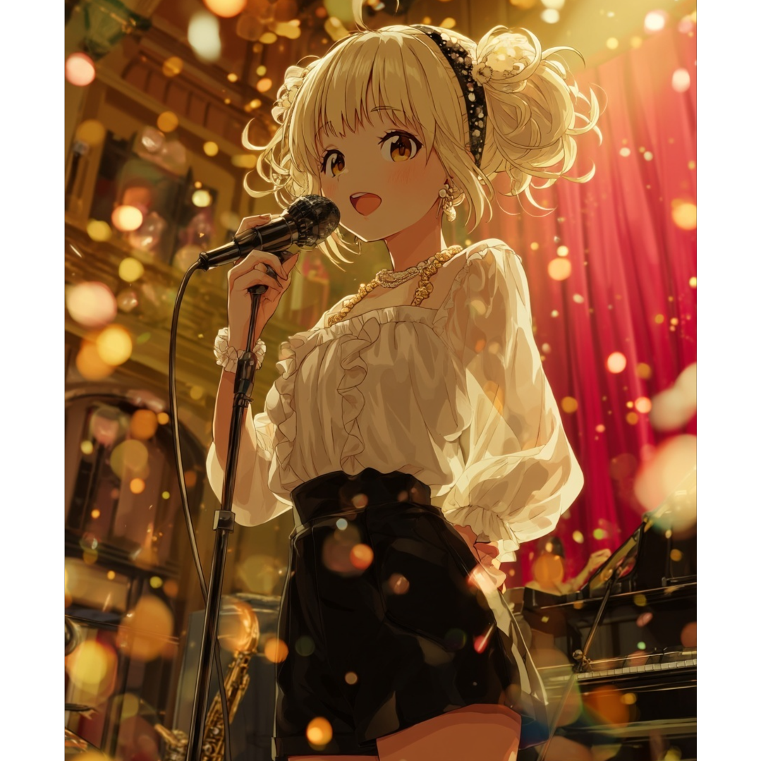 Jazzy house track with vibrant live-band energy and sweet female idol vocals, Tempo 122 BPM, swinging house groove with crisp drums, brushed snares, and lively ride cymbals, Warm electric bass walks through jazzy chords, joined by lush Rhodes piano, smooth organ pads, and bright strings, Expressive saxophone solos and playful piano runs intertwine around the vocals, Female idol voice: clear, melodic, and emotional — singing with elegance and warmth, blending pop charm with jazz phrasing, Include light scatting and whispered ad-libs between verses for intimacy, Choruses are bright and rhythmic, supported by group harmonies and subtle crowd shouts (“ハイ!ハイ!”), Mix: warm, analog, and live — like a sunset lounge show meets idol concert, Mood: sophisticated, uplifting, romantic, and groovy, no text, no logo, cinematic lighting, 4k