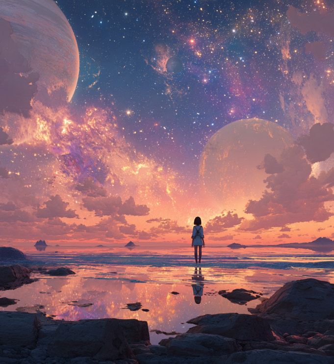Emotional Japanese Male Vocal Ballad, slow tempo (~75 BPM), Cinematic and atmospheric pop with piano, strings, soft pads, deep bass, and subtle drums, Mood: sentimental, romantic, slightly sci-fi, like quantum love under the stars, Expressive male vocal with emotional dynamics and reverb-rich tone, Include gentle “ah〜”, “oh〜”, “yeah〜” ad-libs before/after choruses and in the outro, with long rising notes, Ethereal, heartfelt, and space-like ambience fading into silence