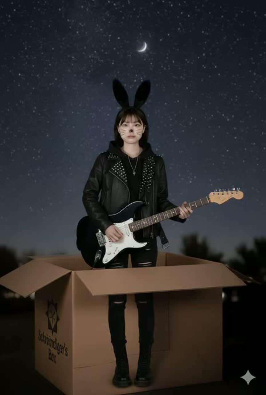 Japanese 80s-style sci-fi street rock, tempo 170 bpm, classic 8-beat 4/4, Raspy male lead vocal sings rhythmically using "Ton" and "Tsu" syllables for Morse-style parts (A/Bメロ・間奏), sings original Japanese lyrics in the choruses and Last Chorus, High-tone sexy female backing vocals for short call-and-response ad-libs (“Yeah!”, “Oh yeah!”, “Hey!”) panned right, Female voice does not sing main melody—only short ad-libs in choruses, Crunchy distorted guitars, heavy bass, pounding drums with bright snare, and raw live-club garage rock sound, Occasional retro synth stabs and beeping Morse-code-like FX in intro and bridges to emphasize sci-fi/quantum theme, Ton/Tsu syllables in Morse parts slightly shorter than regular notes for rhythmic effect, Energetic, raw, bold, slightly humorous, Ending slows into a bluesy, expressive guitar jam fading out naturally, Language: Japanese