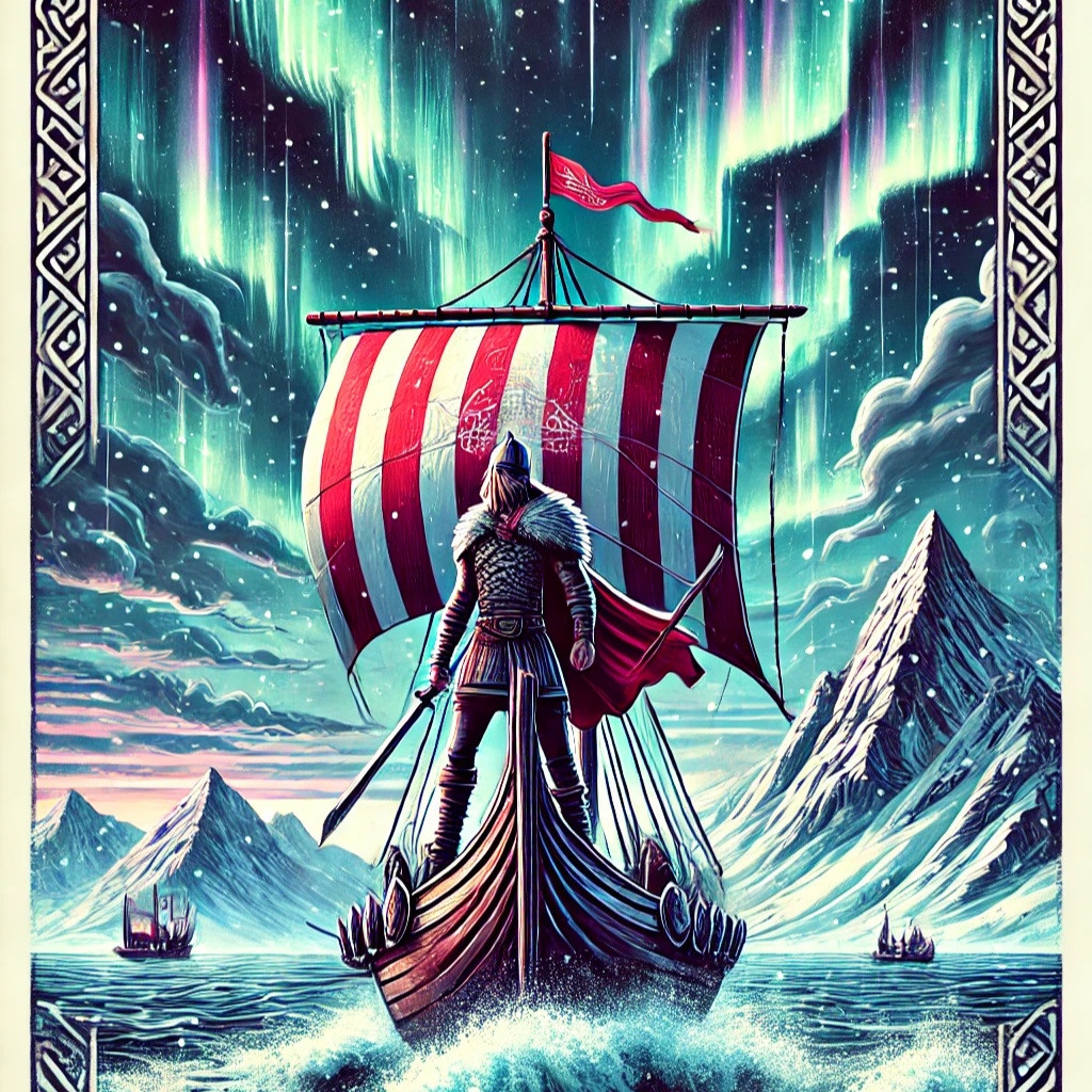 Epic, Nordic folk-inspired orchestration, slow and majestic tempo, deep male choirs, atmospheric strings, powerful war drums, ancient lyre melodies, heroic tone, evoking Viking sagas, cinematic and im