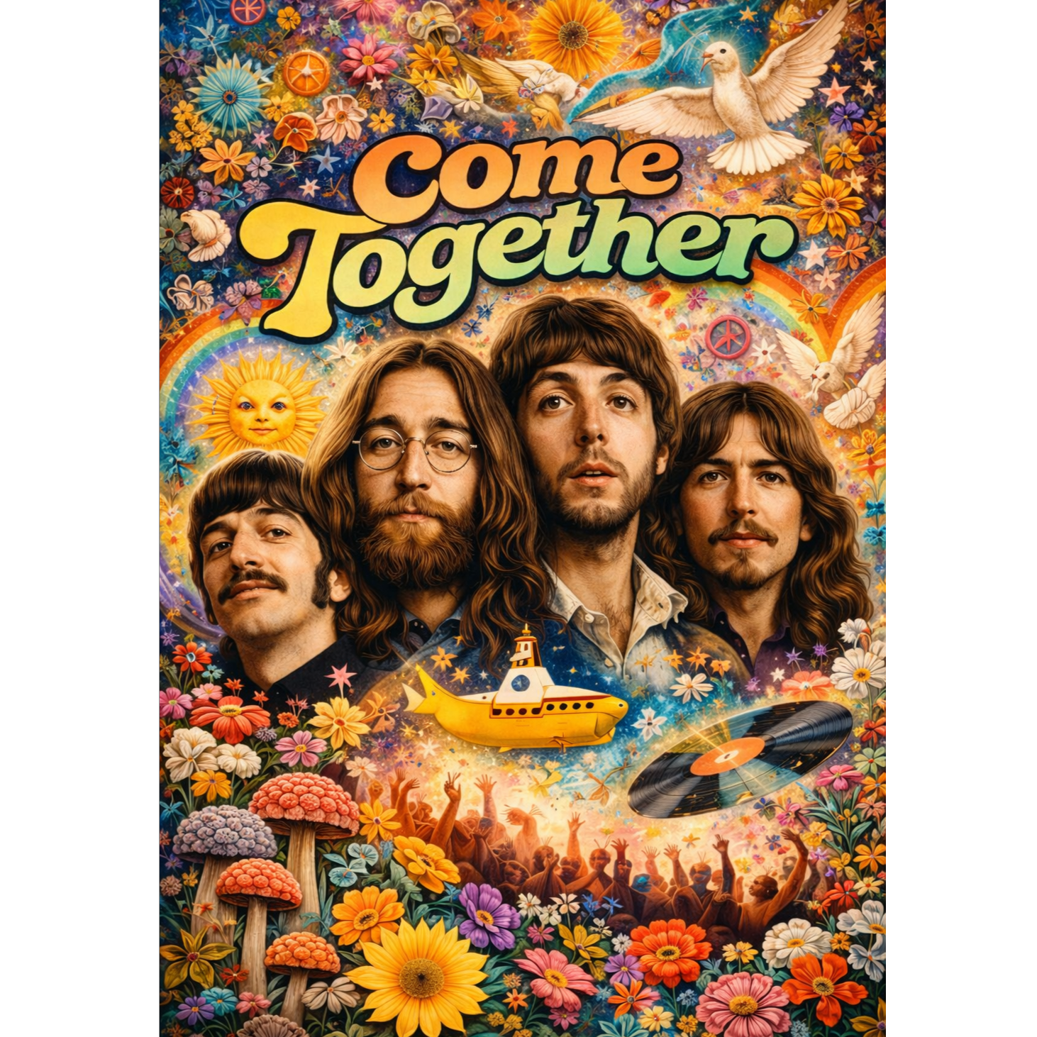 British rock, band, 60s, old rock, psychedelic, strong drug, dynamic bass, strong bluesy, rhythm electric guitar, male voice, husky voice, chorus, middle voice, husky, nasal, harmony, drum, lead and rhythm electric guitar, Innovative melody line, Create a Beatles-style psychedelic blues-rock track inspired by Come Together, The song should have a groovy, slow tempo with a swampy, hypnotic rhythm, Instruments should include fuzzy electric guitar, thumping bassline (Ă la Paul McCartney), laid-back drums with a dry snare, and vintage electric organ fills, The vocal delivery should be hushed and gritty, resembling John Lennon's sultry tone, Use clever wordplay and surrealist imagery in the lyrics, blending mysterious verses with an anthemic, repeated chorus, The overall feel should be darkly playful and off-kilter, yet melodic and soulful, The production should sound analog and warm, like it was recorded in the late 1960s, Include occasional background harmonies and tape delay effects