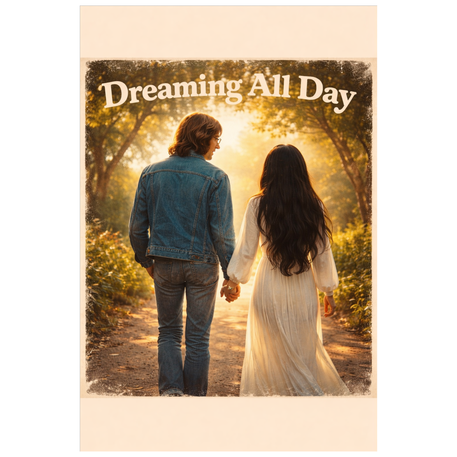 A dreamy psychedelic Beatles-style song titled "Dreaming All Day", Tempo: slow-mid (around 74 bpm), Instruments: acoustic guitar strumming (lazy feel), bass with melodic movement, light brushed drums, floating electric guitar riffs with reversed-effect style, organ/ Mellotron pad in the background, Vocals: Lennon-like nasal tone, slightly lazy and dreamy, double-tracked in chorus, Lyrics: (use provided verses and chorus) A Beatles-inspired psychedelic pop song titled "Dreaming All Day", Style: 1966 John Lenon vibe, similar to "Iâm Only Sleeping", Tempo: ~74 bpm, lazy swing feel, No intro â song starts immediately with verse vocals, Instruments: