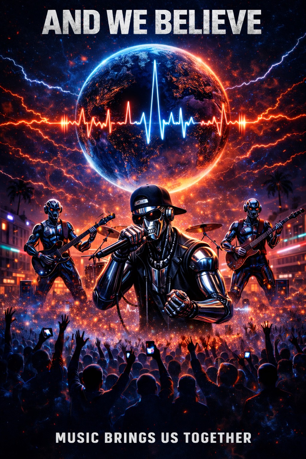 numetal trap metal song with aggressive melodic singer and a separate boom bap rapper voice during the bridge electronicore experimental emo dual vocalists numetal trap metal fusion heavy distorted guitars 808 trap drums dark cinematic atmosphere aggressive melodic vocals anthemic chorus boom bap hip hop bridge with dusty drums and vinyl texture Alternative rock, Nu metal, Rap rock, Electronic rock x Trap metal, Industrial hip hop, Hardcore x trap metal energy emotional theme about music bringing people together