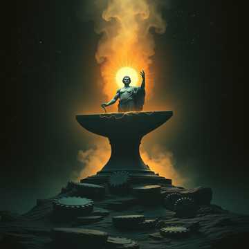 This 7:31 progressive metal epic launches with industrial SFX—hammer, anvil, metallic drones—melding into mechanized, dissonant djent riffs, Crushing, syncopated guitars meet pounding kit grooves, while 80s-inspired virtuosic leads soar above relentless polyrhythms, Verses pulse with growled, menacing male vocals, harmonized in choruses by dual clean melodies, underscoring existential fury, Layered synths evoke cosmic vastness; technical guitar solos burn over shifting time signatures, Intensity escalates from relentless industrial grind to a polyrhythmic, apocalyptic breakdown, the mood shifting from oppressive heaviness to explosive, defiant collapse in a final, triumphant outburst