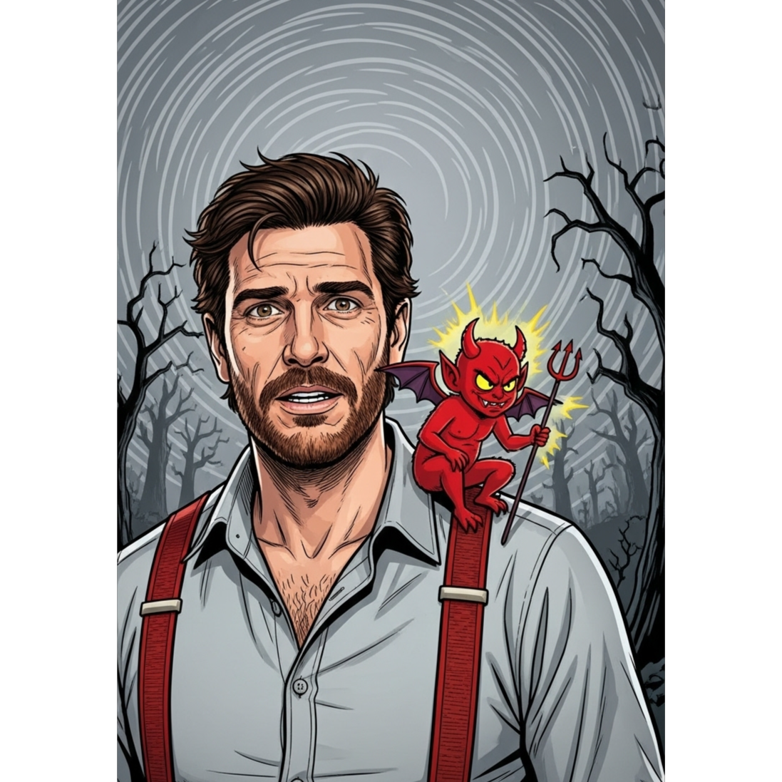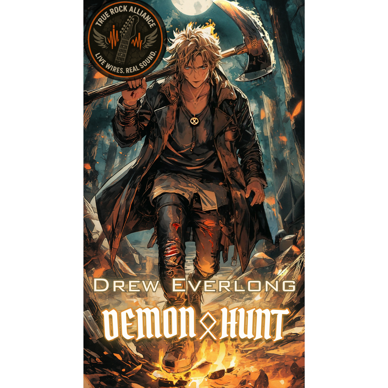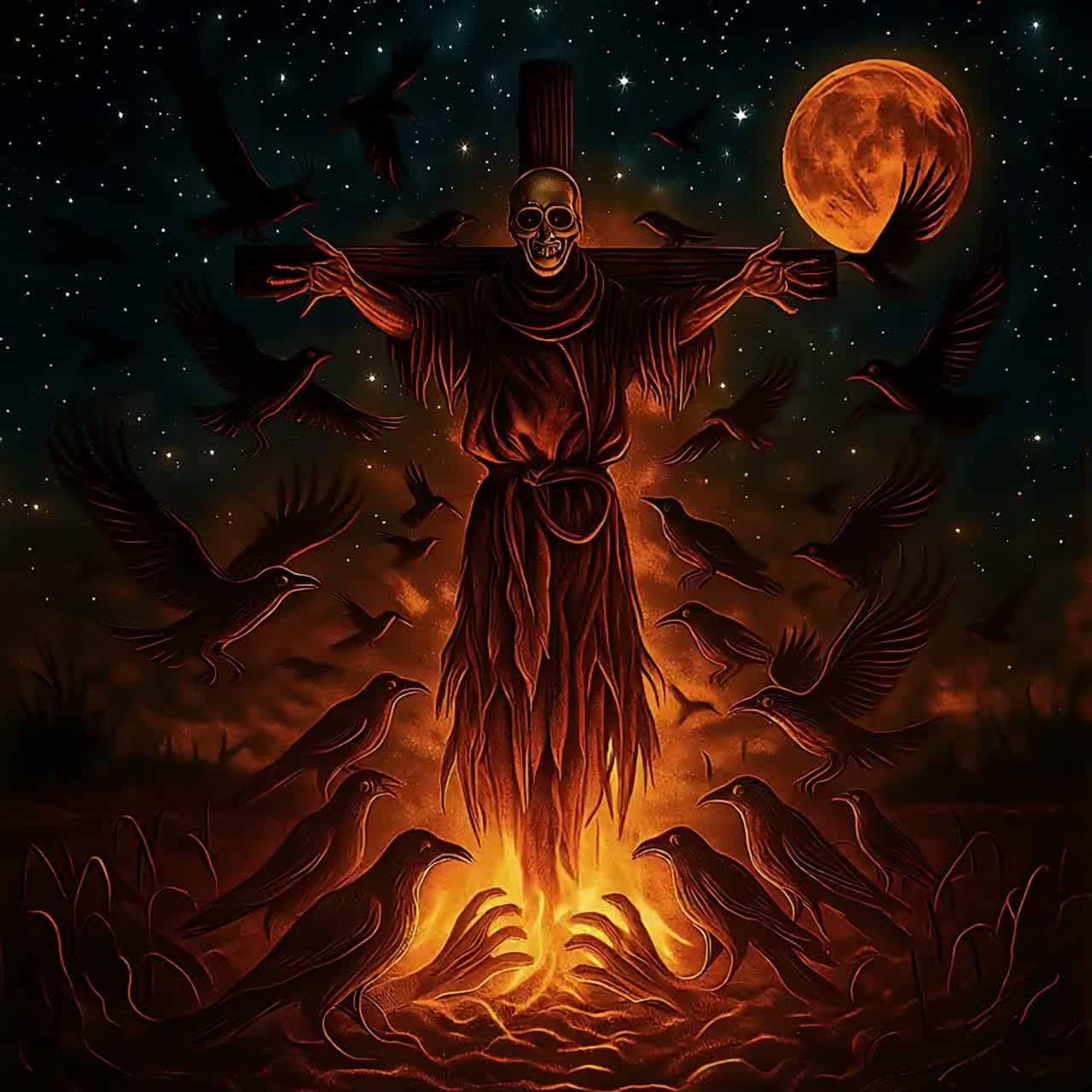 Moonlit pagan-metal hunt song in a dark minor key, Tempo: slow-mid (90โ110), Marching 6/8 or heavy 4/4 stomp with tribal toms and frame-drum patterns (โซ), Crunchy power-chord guitars (โก), sharp C/C# hooks + slide accents, and a haunted harmonica motif (โถ) that doubles/answers riffs, Lead: baritone, operatic, sustained vibrato; verses brood with whispered chants and low drones; pre-chorus tightens; choruses explode with gang shouts and axe-swing cymbal crashes, Angular dissonances, sudden dropouts to breath/whispers, then surging walls of guitars, Plate/arena reverb (โง) for cavernous scale; harmonica + vox stay centered and forward, Indie-grit ร glam-metal swagger (โฟ), Narrative: witch-hunt pursuit through the forestโominous, imposing, relentless, Dark Haunting Lyrical Flow โ Demonic โข Paganistic โข Spooky โข minor-mode, harmonica-led motif (โถ) โข baritone operatic vox (โ) โข tribal tom-stomp (โซ) โข crunchy power-chords (โก) โข plate/arena verb (โง)