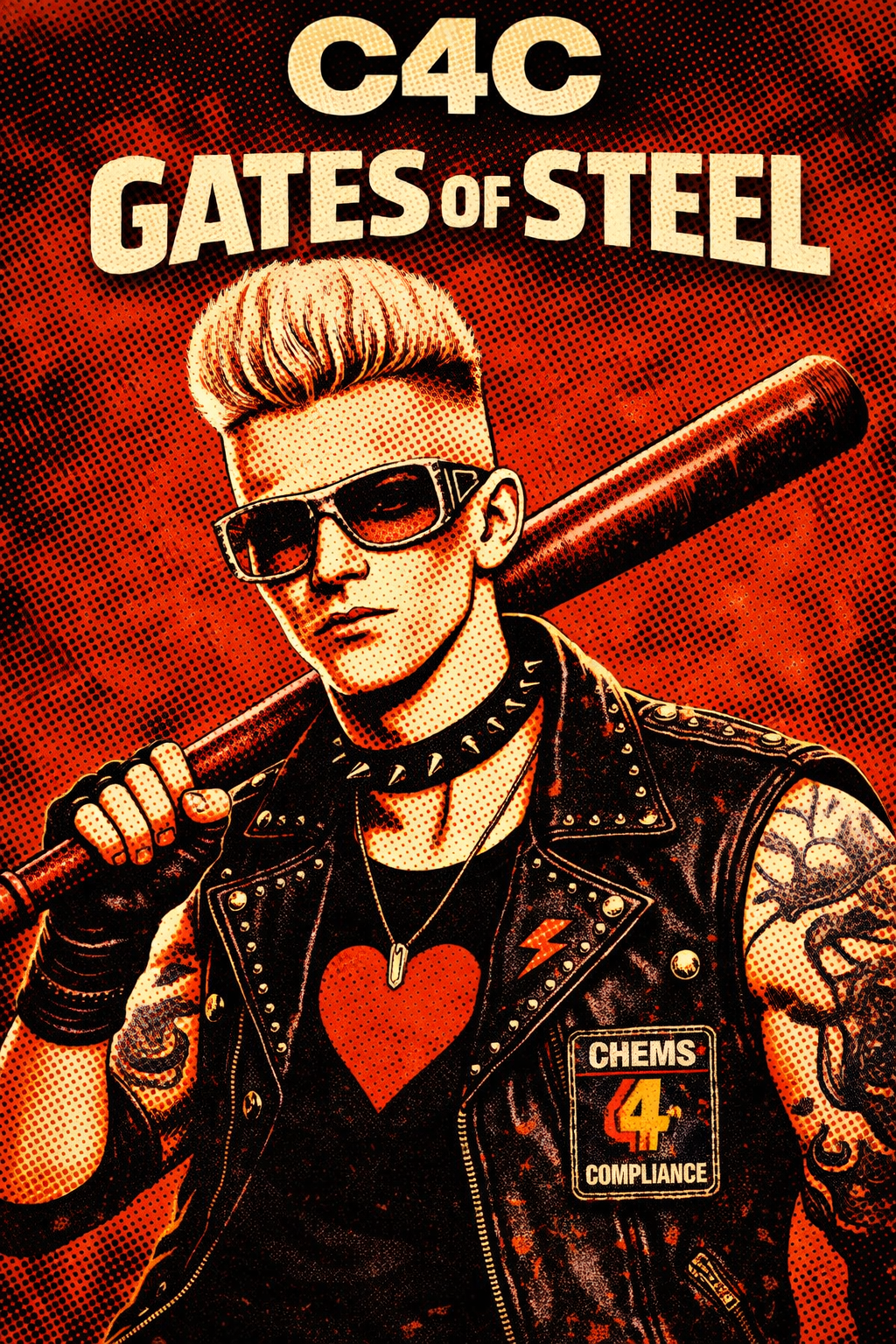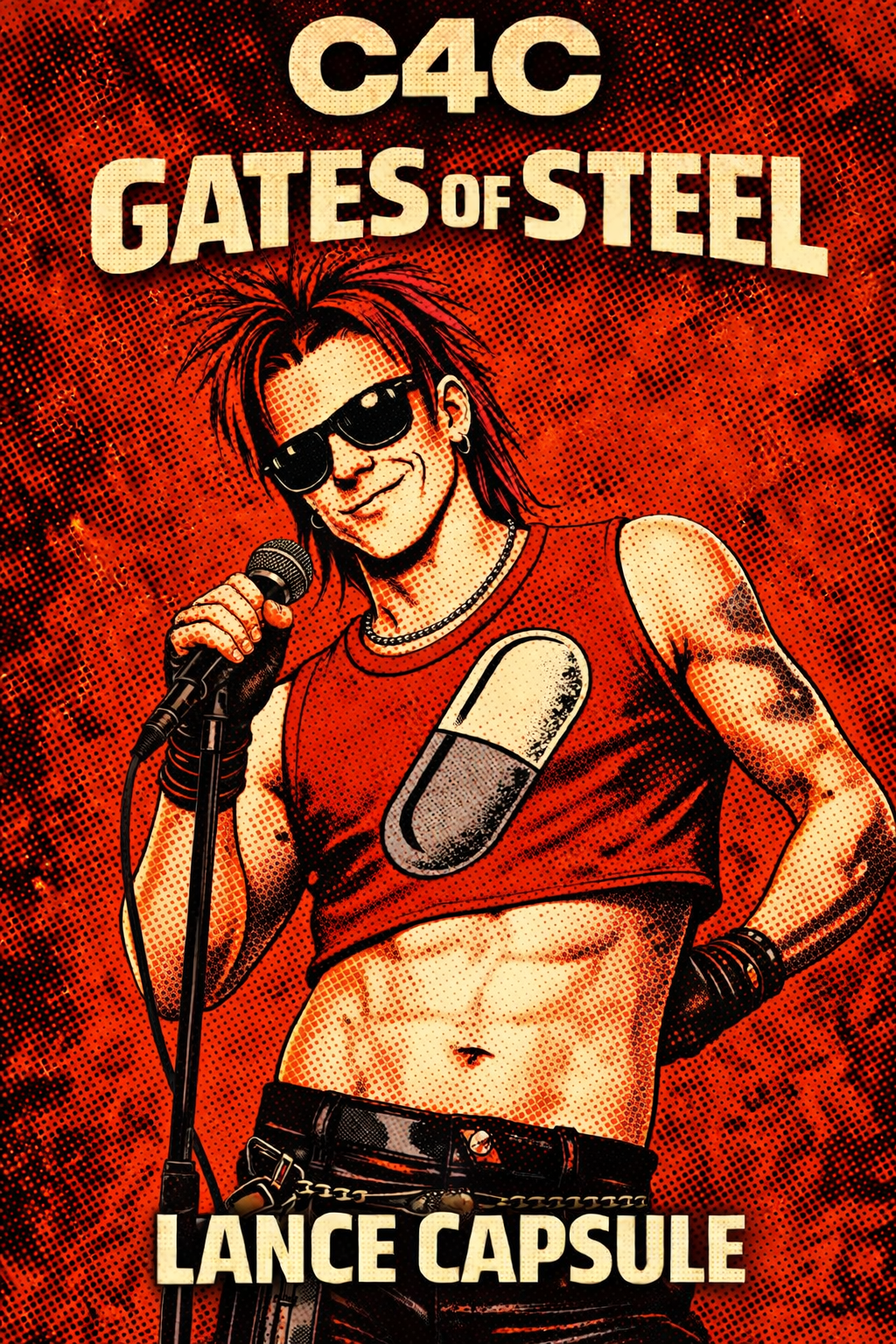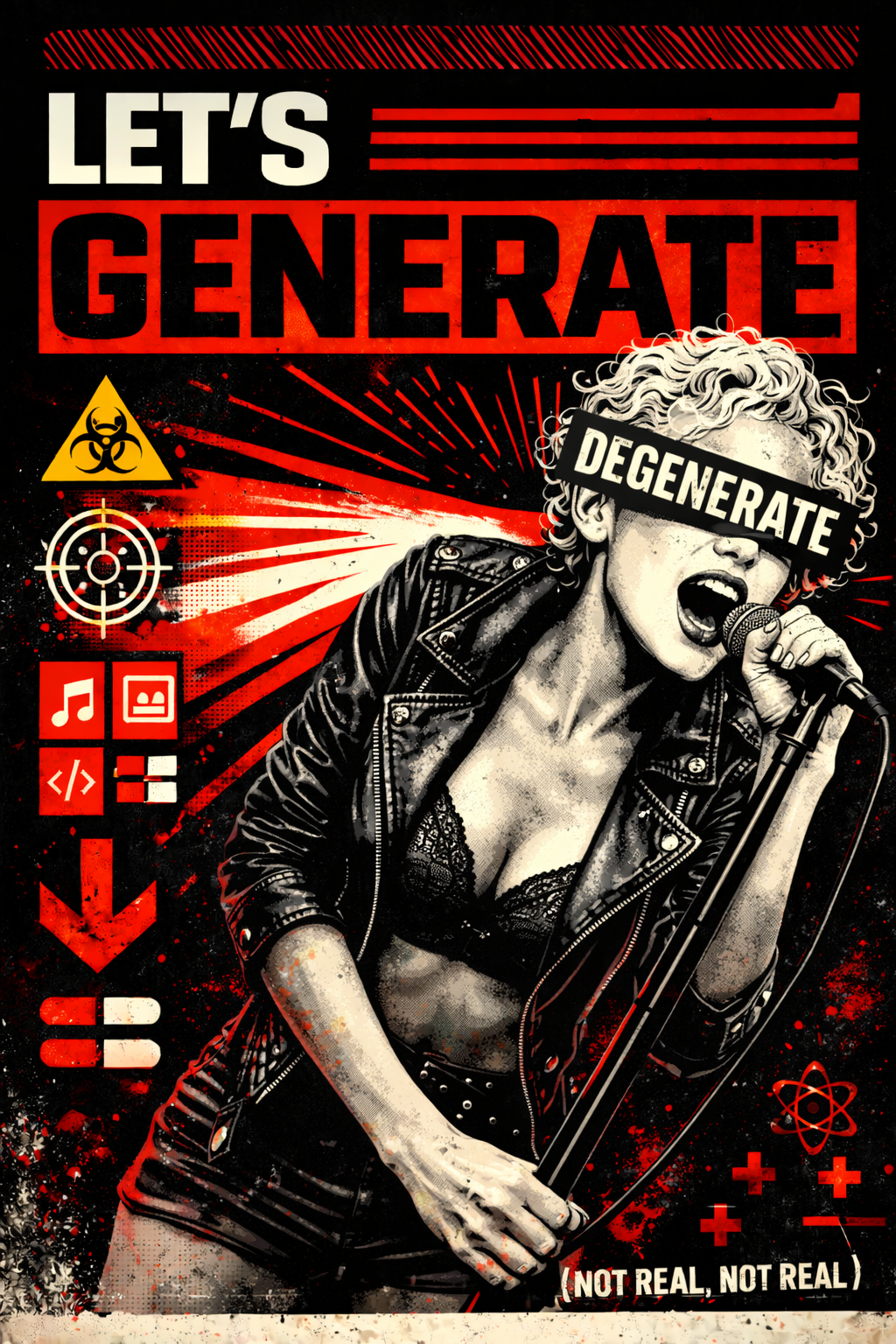 High-energy synth-punk track with a driving four-on-the-floor beat, distorted synth bass, minimal guitar stabs, and shouted gang vocals, Cold, mechanical, and catchy with a militaristic pulse and ironic swagger, Lyrics are sparse and percussive—short phrases that pause frequently, letting repeating synth lines and drum patterns carry momentum between lines, Vocal delivery feels embedded in the groove rather than continuous, creating space so repetition feels hypnotic, not lyrical, Sleazy, futuristic, and confrontational—danceable but aggressive, glossy but wrong