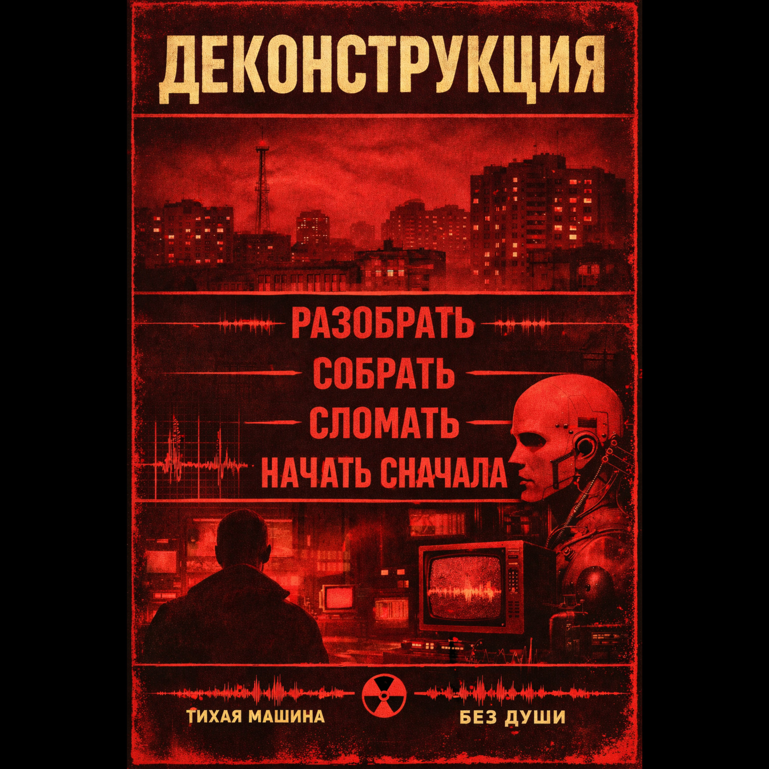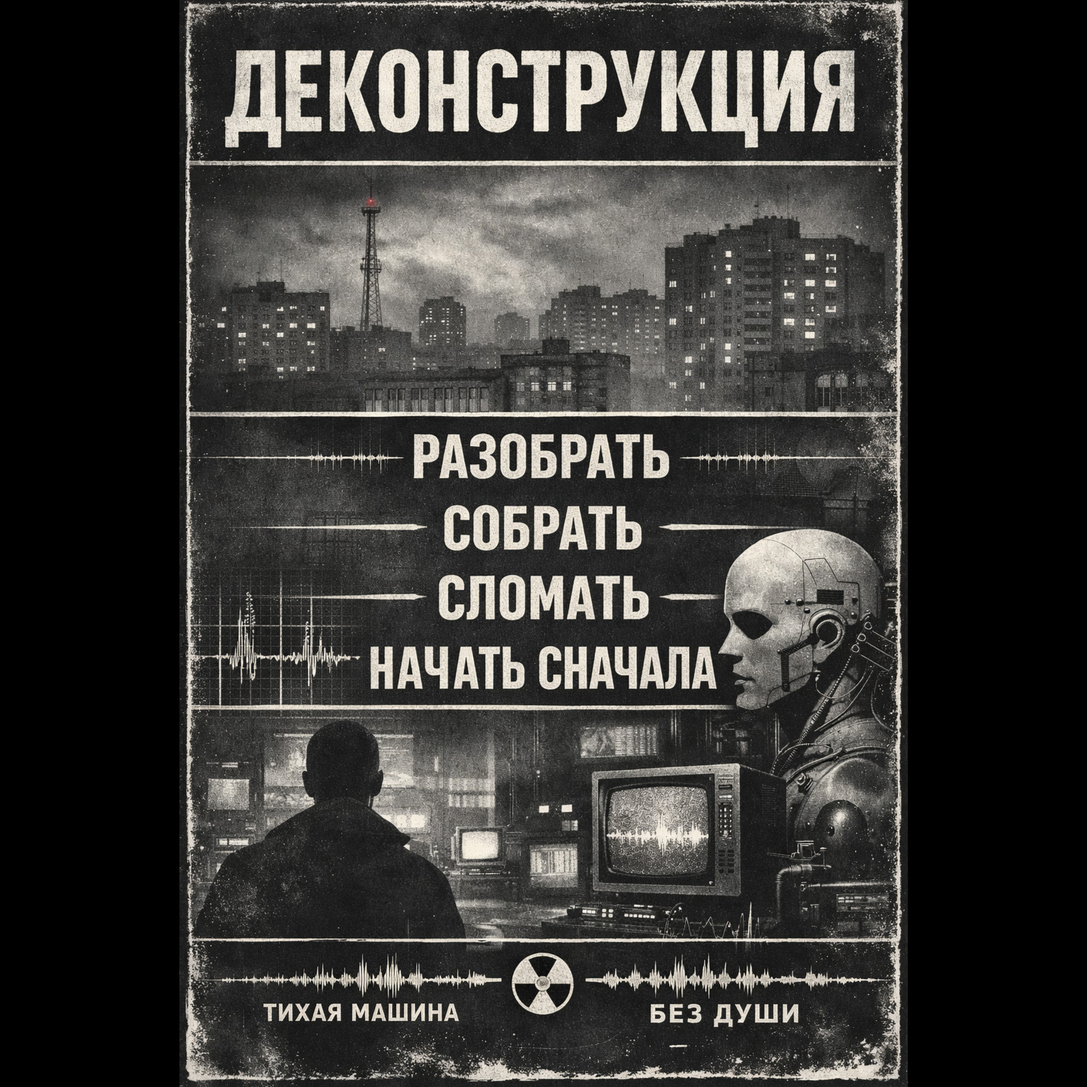 Cold post-punk / darkwave track with a slow hypnotic tempo around 95–105 BPM, deep melodic bassline carrying the song, rigid mechanical drum machine with steady kick and snare, icy analog synth pads and sparse chorus-drenched guitar accents, minimal arrangement with lots of space between phrases, vocals delivered in a calm detached monotone baritone with slight reverb, chant-like lines and repetitive phrases rather than narrative lyrics, atmosphere bleak and nocturnal like walking through empty concrete apartment blocks under dim streetlights, restrained and melancholic but still rhythmic and danceable, analog textures, hypnotic repetition, subtle industrial edge
