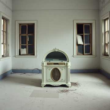 Dark ambient instrumental built around a lone melody box still playing in an abandoned home, Begin with faint mechanical creaks and distant room tone — the hum of decay and forgotten air, The music box plays a slow, detuned lullaby: fragile, slightly out of tune, echoing through empty space, Layer with subtle ambient textures — wind seeping through cracked windows, faint reverb tails bouncing off hollow walls, and the occasional clink of falling debris, The tempo should feel fluid and unsteady, like time itself breaking down, Include moments of mechanical stutter — the box winding down, catching, then restarting, Use reverb, tape flutter, and gentle distortion to convey the corrosion of time, Avoid rhythm or percussion, Let the piece breathe in sorrow and distance, Mood: desolate, nostalgic, ghostly, suspended between life and oblivion — a melody that refuses to die