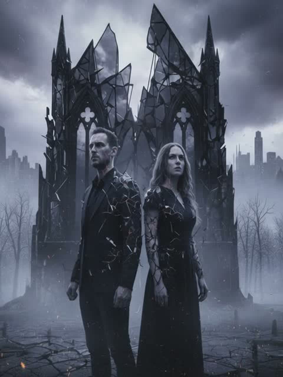 Epic cinematic orchestra in a minor key fused with darkwave atmospheres, deeply emotional and haunting, Sweeping strings, bold low brass, deep timpani, and thunderous percussion are layered with brooding synth pads, pulsing basslines, and moody electronic textures, Haunting melodies, arpeggios, cinematic risers, and one male and one female vocal convey tension, sorrow, and awe, Swells, crashes, and echoing effects punctuate key moments, blending orchestral power with darkwave shadow for an intimate, emotionally charged cinematic experience, Perfect for trailers, climaxes, and dramatic storytelling
