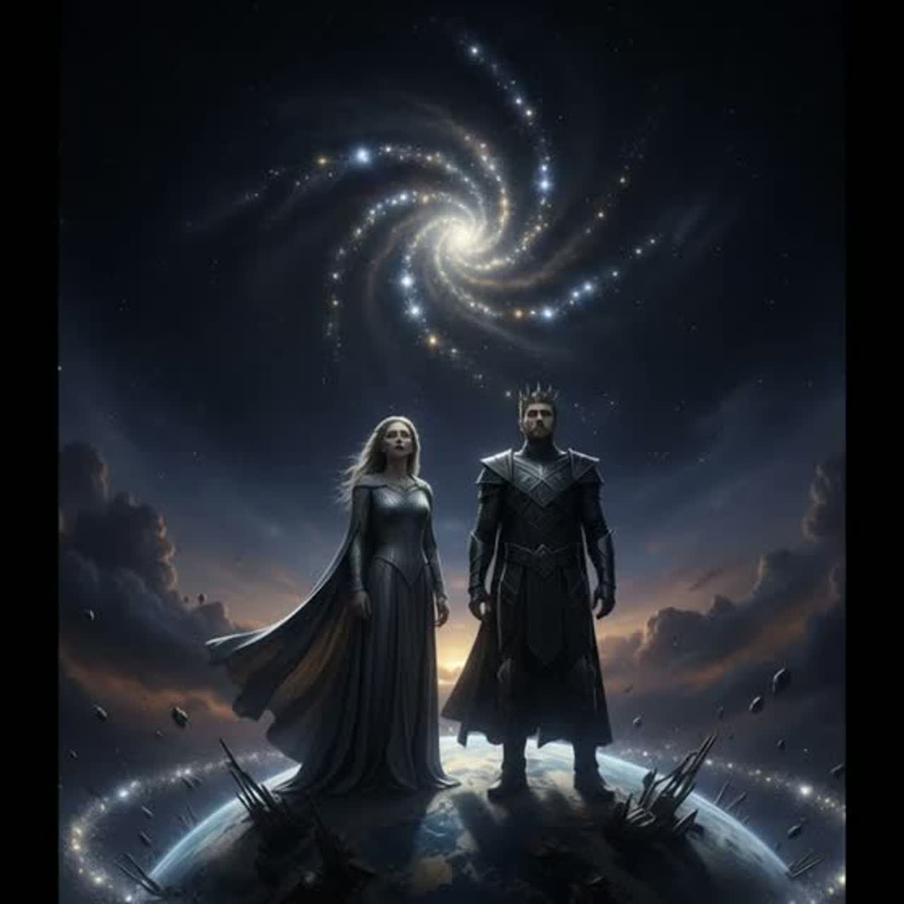 Cinematic space rock anthem with an expansive, atmospheric production, The track opens with ethereal, layered vocal harmonies and a pulsing synthesizer pad, creating a sense of vastness, A steady, mid-tempo drum beat enters with a deep kick and crisp snare, driving the rhythmic foundation, The arrangement features soaring electric guitar leads with heavy reverb and delay, alongside a prominent, melodic bassline, Male and female vocals alternate and blend, characterized by a clean, emotive delivery and occasional operatic flourishes, The harmonic structure revolves around minor-key progressions that resolve into triumphant, major-key choruses, Production techniques include wide stereo imaging, lush ambient textures, and a dynamic mix that builds from intimate verses to a powerful, orchestral-influenced climax, The tempo is approximately 75 BPM, maintaining a deliberate, majestic pace throughout