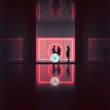 Instrumental 80s Electronic Pop, driving synth bass, rhythmic electronic percussion, shimmering arpeggios, atmospheric synth pads, occasional male spoken phrases, female ethereal vocal snippets, nocturnal, dynamic, urgent, clean production