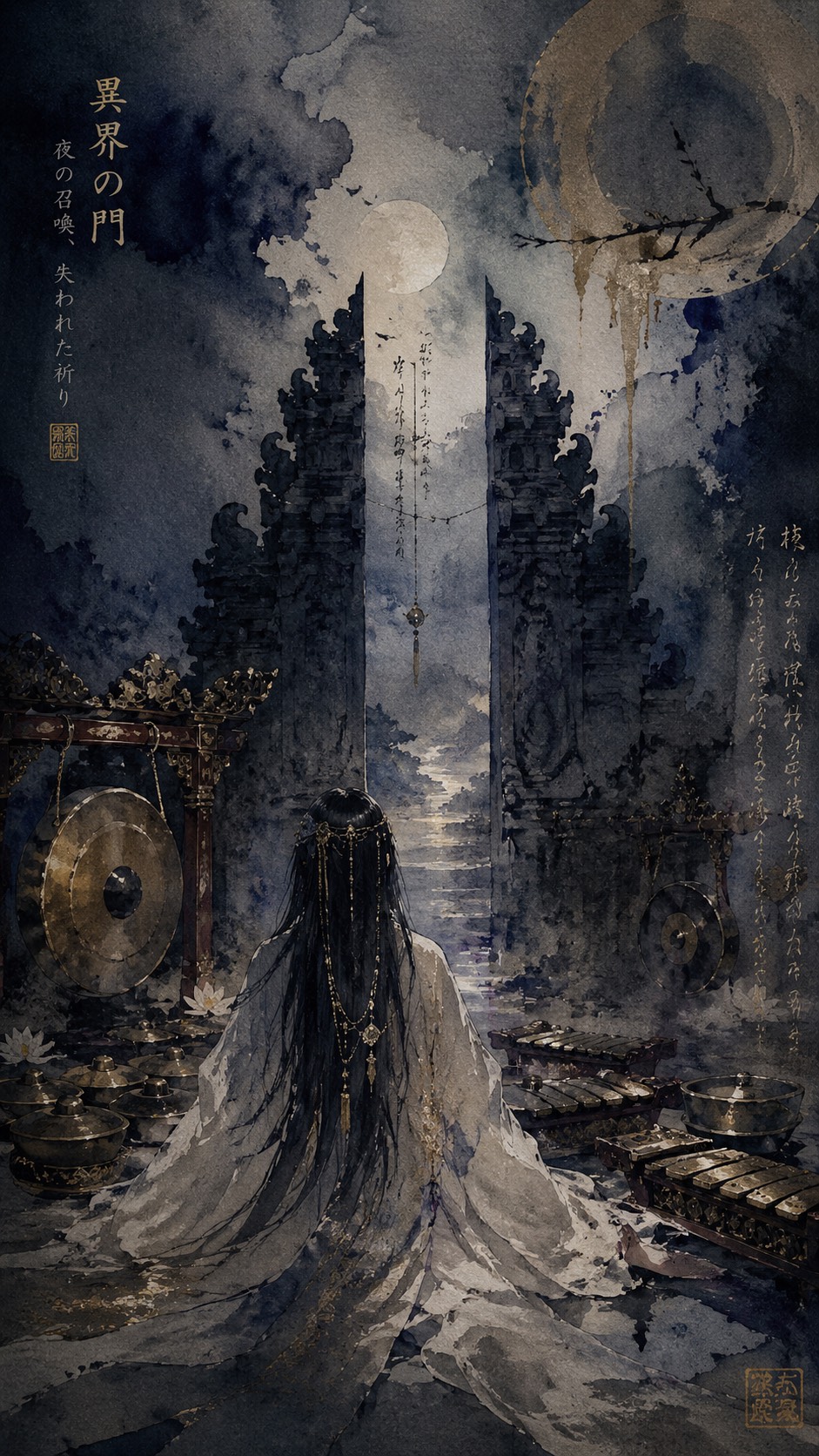 Create A Slow Ritual Gamelan Lament Focused On Loss And Invocation, Use Bonang, Saron, Gender, Kenong, Gong Ageng, And Soft Kendang As The Core, Let Gong Cycles Function As A Breathing Gate, Expanding And Closing In Long Intervals, Build The Sound From Metallic Resonance, Drone Layers, And Wide Silent Space, Place The Female Vocal Behind The Instruments, Make It Half Song, Half Prayer, Let The Voice Sound Fragile, Possessed, And Drawn Toward Something Unseen, Do Not Let The Vocal Lead; Let It Drift, Fade, And Reappear Inside The Resonance, Use Soft Ah-Chants, Whispered Echoes, And Distant Shadow Chorus As Fragments From Beyond The Gate, Let Languages Blend As Sound Rather Than Meaning, Keep The Structure Slow, Static, Cyclical, And Non-Triumphant, Let The Emotion Shift Gradually From Longing To Obsession Without Any Sudden Lift Or Release, ‑Pop Structure, ‑Chorus Lift, ‑EDM, ‑Rock, ‑Dance Groove, ‑Cinematic Heroic Swell, ‑Triumphant Emotion, ‑Bright Idol Vocal, ‑Strong Lead Vocal, ‑Belting, ‑Aggressive Shouting, ‑Fast Tempo, ‑Modern Pop Production