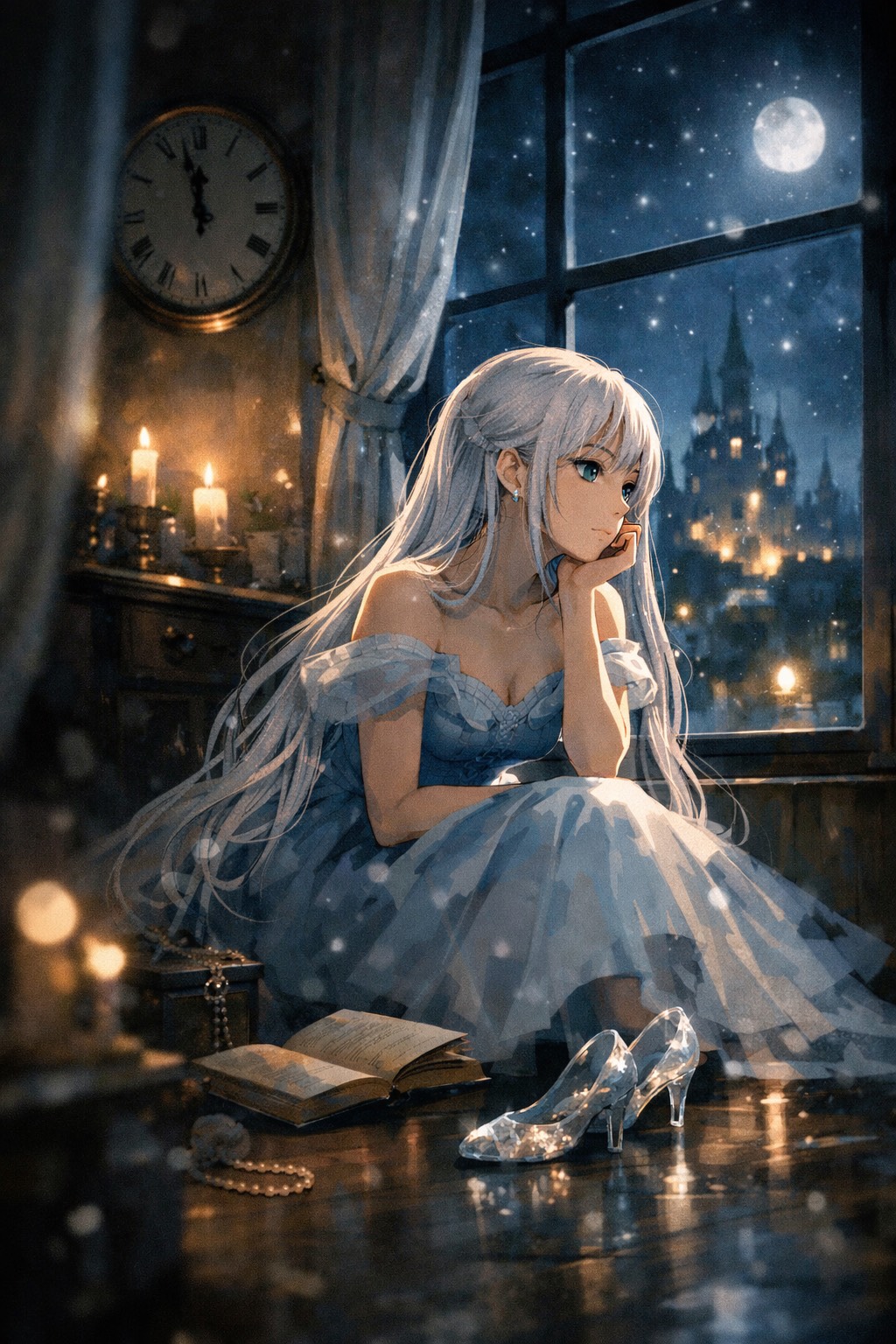 Japanese Nocturnal Chamber Waltz Pop, 84 Bpm, 3/4, A Minor, Close-mic female vocal, transparent but lived-in, mostly straight tone, minimal vibrato, soft but firm articulation, Dry and intimate in front, No idol sweetness, no heroic lift, no big belting, no melodramatic sobbing, Felt piano, low strings, subtle harp, thin woodwinds, broken celesta fragments, Inward-circling waltz pulse, not marching, Bittersweet harmony with add9, minor 9, suspended tension, unresolved cadences, Verses story-led and intimate, Pre-choruses tighten the chest, Choruses wider but still restrained, more ache than power, Bridge nearly bare before one close spoken line, Thin female choir or breathy doubles only in final chorus and outro, Ending dissolves gently with no hard stop, Mood: fairy-tale disillusion, quiet resistance, priced beauty, and the wish to dance anyway