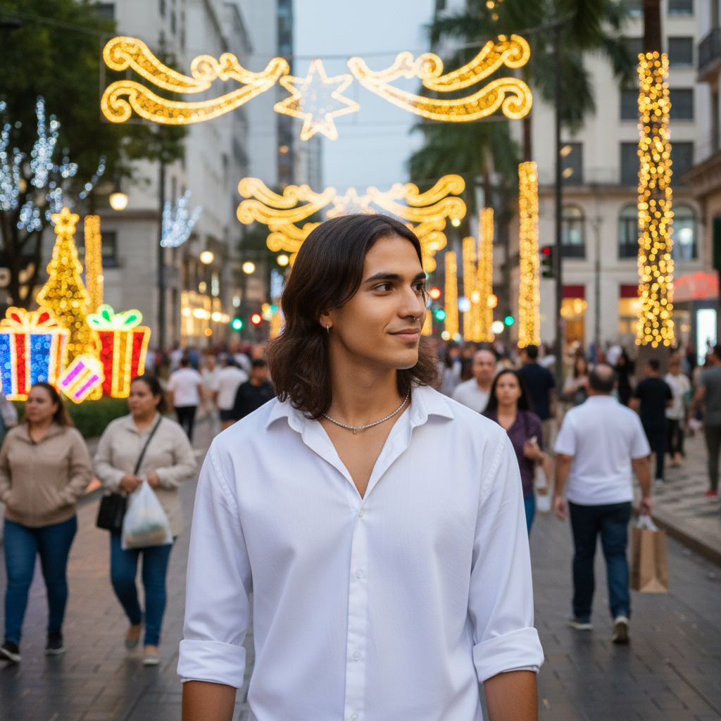 Modern Brazilian pop / contemporary MPB with a hit-oriented Christmas vibe, Medium tempo (≈92–98 BPM) with subtle Brazilian swing, Main instrumentation: nylon-string guitar with muted rhythmic strums and light percussive accents; warm, rounded bass; organic pandeiro with ghost notes; light shaker for continuous motion, Acoustic piano used minimally (short stabs in verses, sustained chords in pre-chorus), plus very soft warm pads for harmonic support, Vocals are close-mic, intimate and conversational in verses; open, melodic and sing-along in the chorus with backing vocals in thirds and occasional octaves, Very subtle choir texture only to enhance emotional lift, not gospel, Christmas elements kept modern and restrained: extremely light sleigh bells only in chorus and final section, Arrangement grows by layers, never epic, Clean, warm mix, controlled low end, clear vocal presence, short natural reverbs, Streaming-ready master with preserved dynamics, moderate loudness, cozy/contemporany