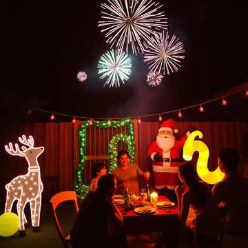 Upbeat Christmas pop with lots of bells and jingle chimes, soft punchy drums, cheerful groovy bass, and bright acoustic guitar, Fun, playful and festive mood, Light male or female lead vocals, warm and friendly tone, family-friendly, Brazilian Christmas vibe with summer feeling: backyard barbecue, fireworks in the sky, colorful decorations, joyful celebration, Catchy chorus with repeated “Natal, Natal, Natal”, Bright, happy and radio-ready sound