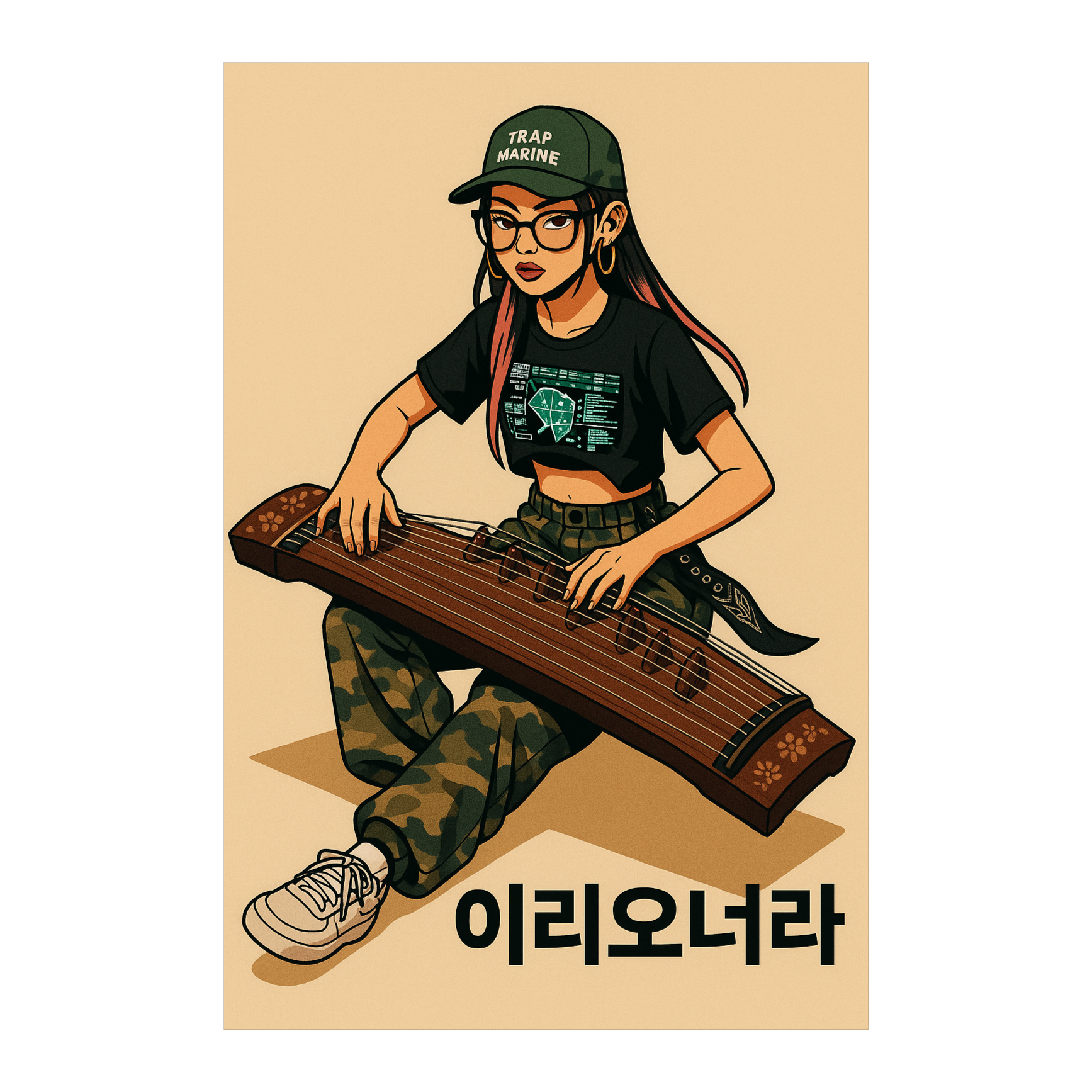 Traditional Korean music meets trap, Start with a haunting gayageum melody and janggu rhythm, layered with taepyeongso for a bold traditional touch, Then blend in deep 808 bass and modern trap drums for contrast, The beat should highlight Korean instruments prominently, not just as background, Mid-tempo (90 BPM), clean and groovy, Emphasize the fusion — traditional sounds leading into sleek trap rhythm, Drill
