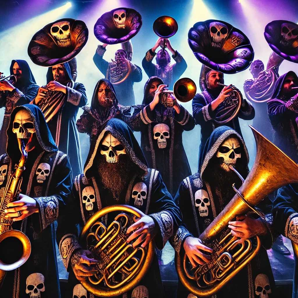 dirty south balkan brass band, chorus, tuba, trombone, trumpet, cajun