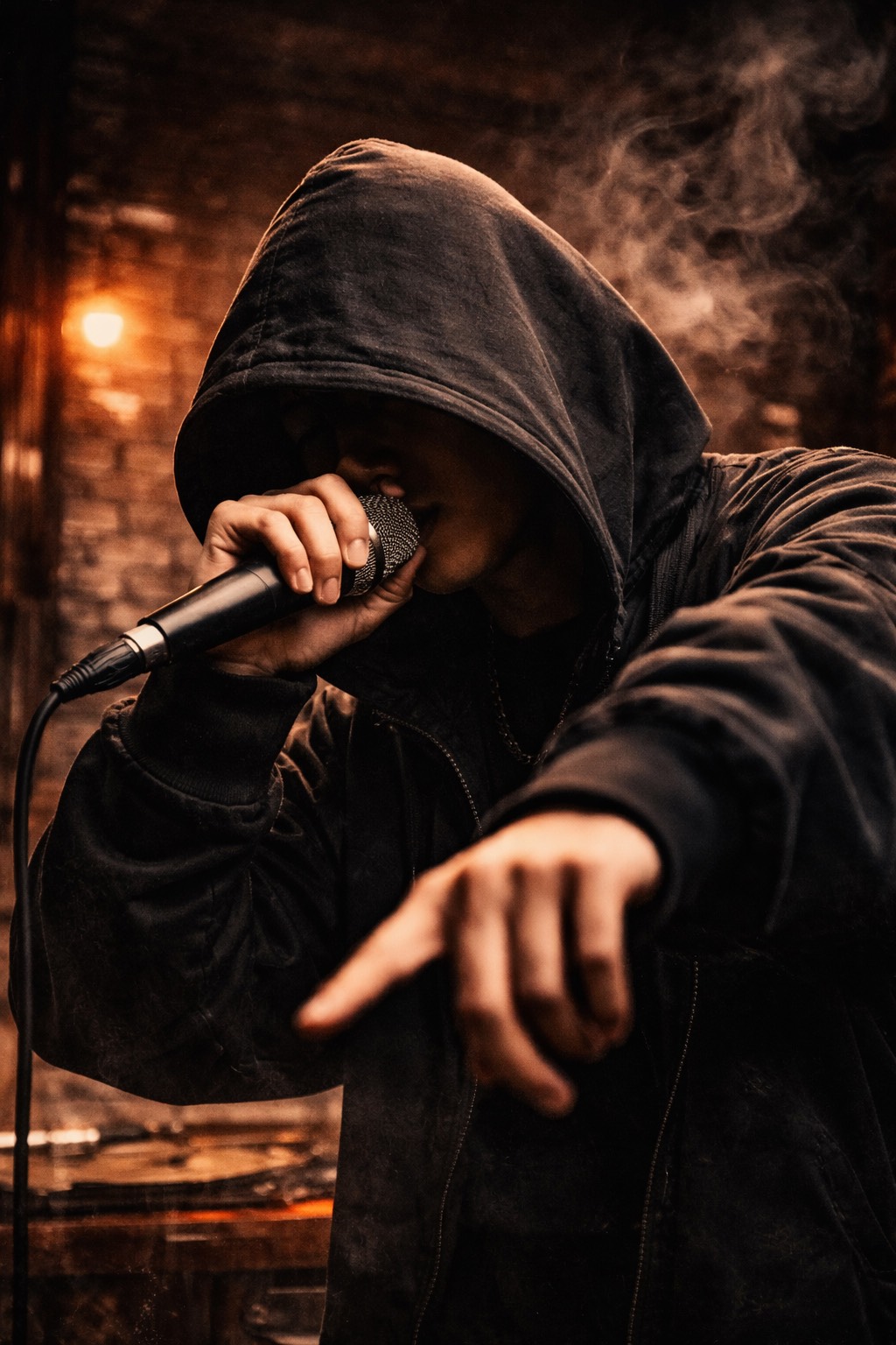 Hard hitting experimental hip-hop, strong punchy drums, deep bass, aggressive rhythm, dynamic flow switches, tense and cinematic atmosphere, male vocal, expressive delivery, include whispered ad-libs and subtle “hmm” background vocals, dark modern production Japanese