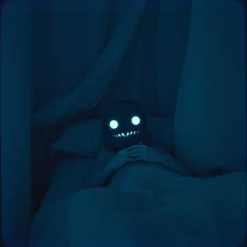 darkly cinematic electro-soul / alt-R&B fusion with chillhop percussion and ambient horror textures, Tempo: 78 BPM in 6/8, Chords: Am – F – C – G (verses), Dm – F – Am – E (chorus), Keys (Synth Pad): low, pulsing drone with reversed reverb tails; morphs between analog warmth and icy shimmer, Bass: sine-wave sub crawling under the mix, heartbeat-like, Guitar: clean, chorus-soaked stabs echo in minor thirds, Drums: brushed snares, side-chain kicks, vinyl crackle texture, Vocals: intimate whisper-sing with layered doubles; monster voice is a pitched-down reflection, not a threat but fear itself speaking gently, Bridge: lo-fi piano + reversed chime motif resolves into hopeful synth bloom—fear dissolves into self-understanding