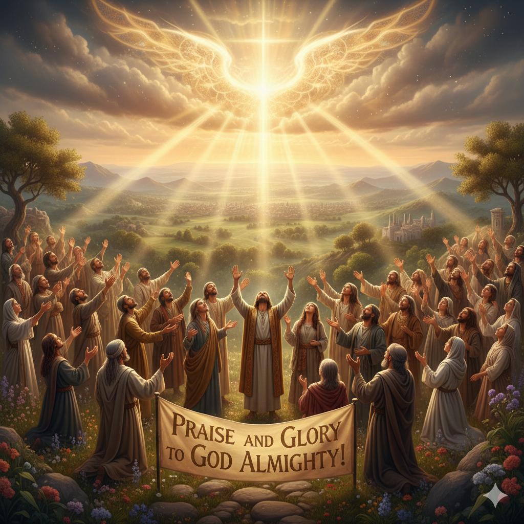 Traditional Catholic hymn, 5-voice SATB ensemble ONLY, song leaders, majestic and reverent, 76-84 BPM, 4/4 time, piano accompaniment, classical strings, sacred polyphony, Renaissance-inspired harmony, Latin Gloria phrases, solemn and uplifting intimate yet powerful