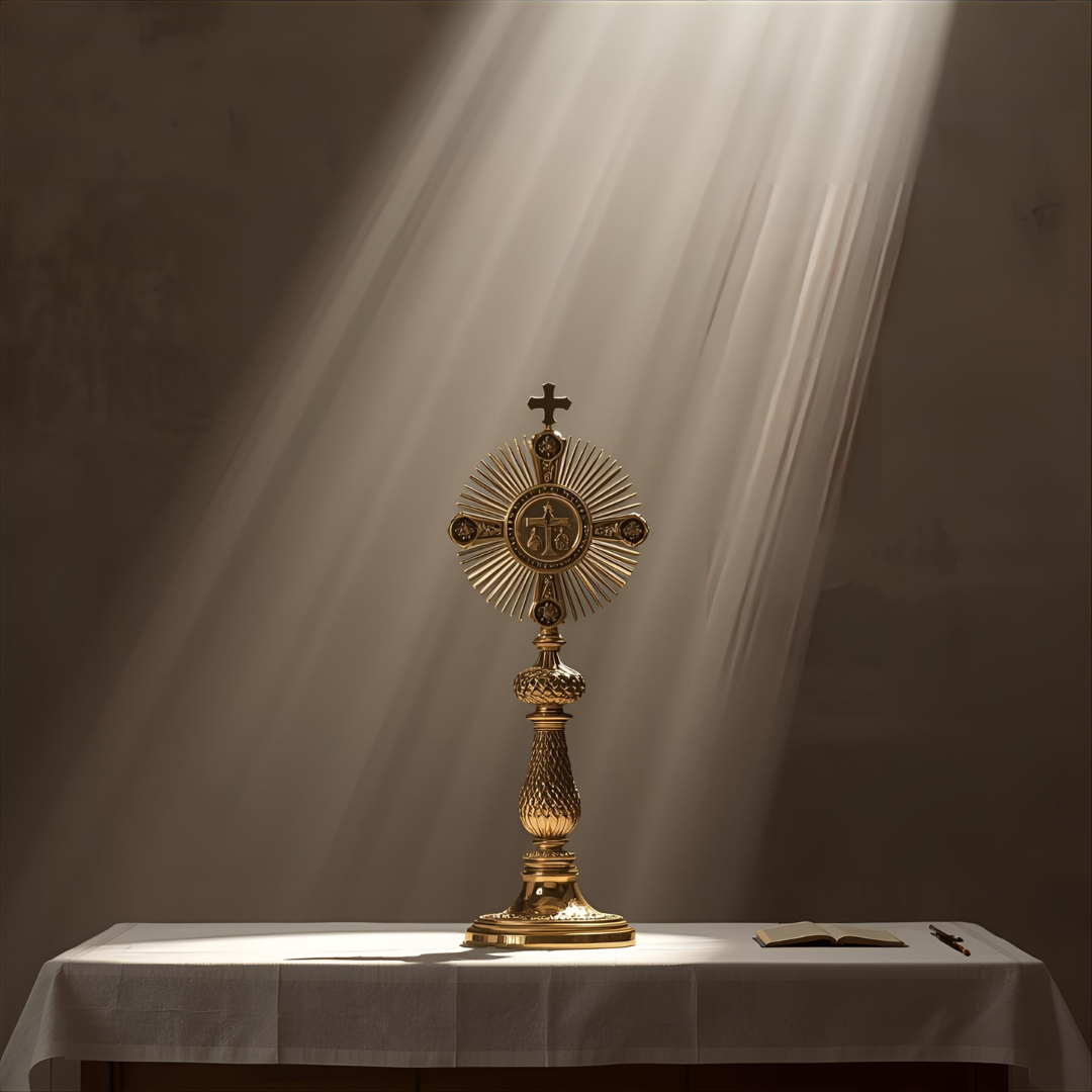 Sacred Catholic worship, male vocals, reverent contemplative, 75 BPM, D Major, gentle piano arpeggios, fingerpicked acoustic guitar, warm strings, subtle pad synths, light drums, ambient electric guitar swells, spacious mix, intimate male vocals, soft harmonies, cathedral reverb, never overpowering, serving the Eucharistic mystery