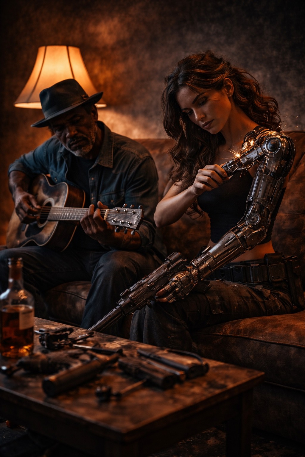 cinematic drops, rap, gritty guitar, dark blues-rap-rock, heavy bass, industrial, rock, hip-hop, metallic textures, swing, blues, industrial energy, electric