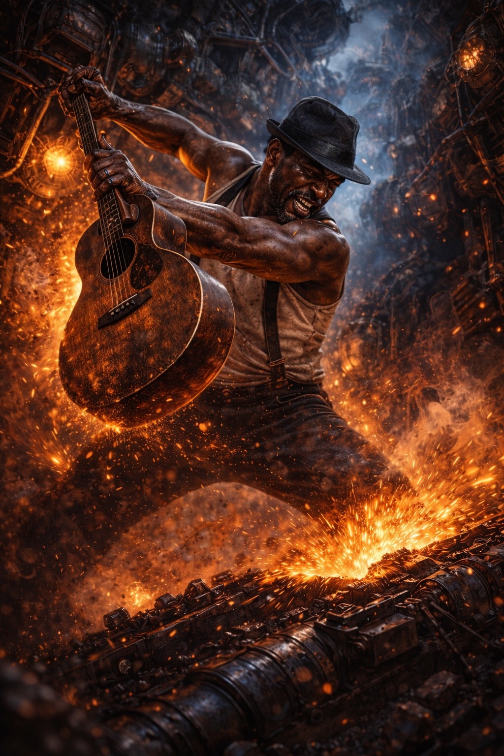 hammer-swing vibe, blues, haunting, deep 808 rap bass, mythic energy, include postmodern background chanting—rhythmic, swing, and sharp, layered voices like a work-song chorus, bold rap vocals, deep, industrial, rhythmic, gritty slides, dark, powerful, confident cadence, raw, aggressive drums, add blues-steel guitar riffs with bending, hip-hop, rap, raw, industrial hip-hop with heavy metallic percussion
