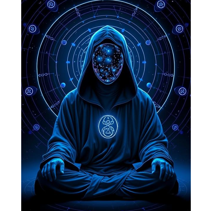 A dark, cinematic deep house track at 126 bpm, driven by a 303 acid bassline fused with Reese undertones and a four-on-the-floor hypnotic groove, Layered atmospheric pads stretch across glitchy arpeggios and ethereal melodic synths, Precise percussion interlocks with subtle industrial and cosmic effects, reversed textures, and echoing digital artifacts, Deep male spoken word, bathed in reverb and delay, floats throughout, commanding with an omniscient tone while rich sound design creates an immersive, celestial landscape—club-ready but vast in scope