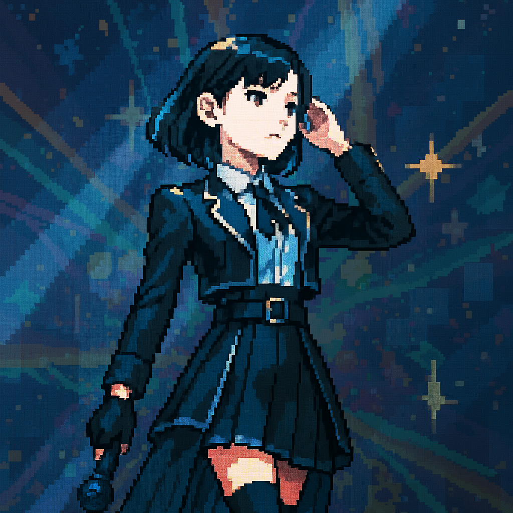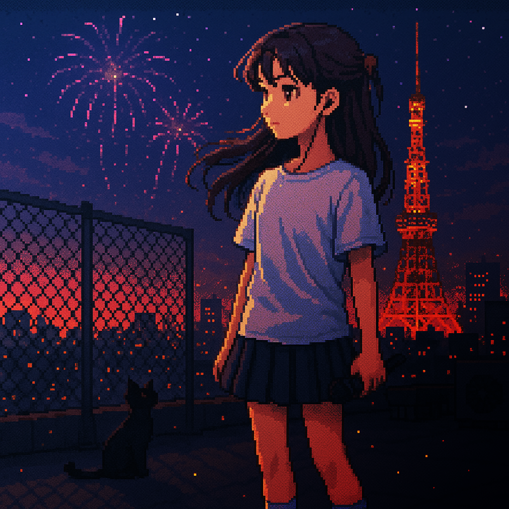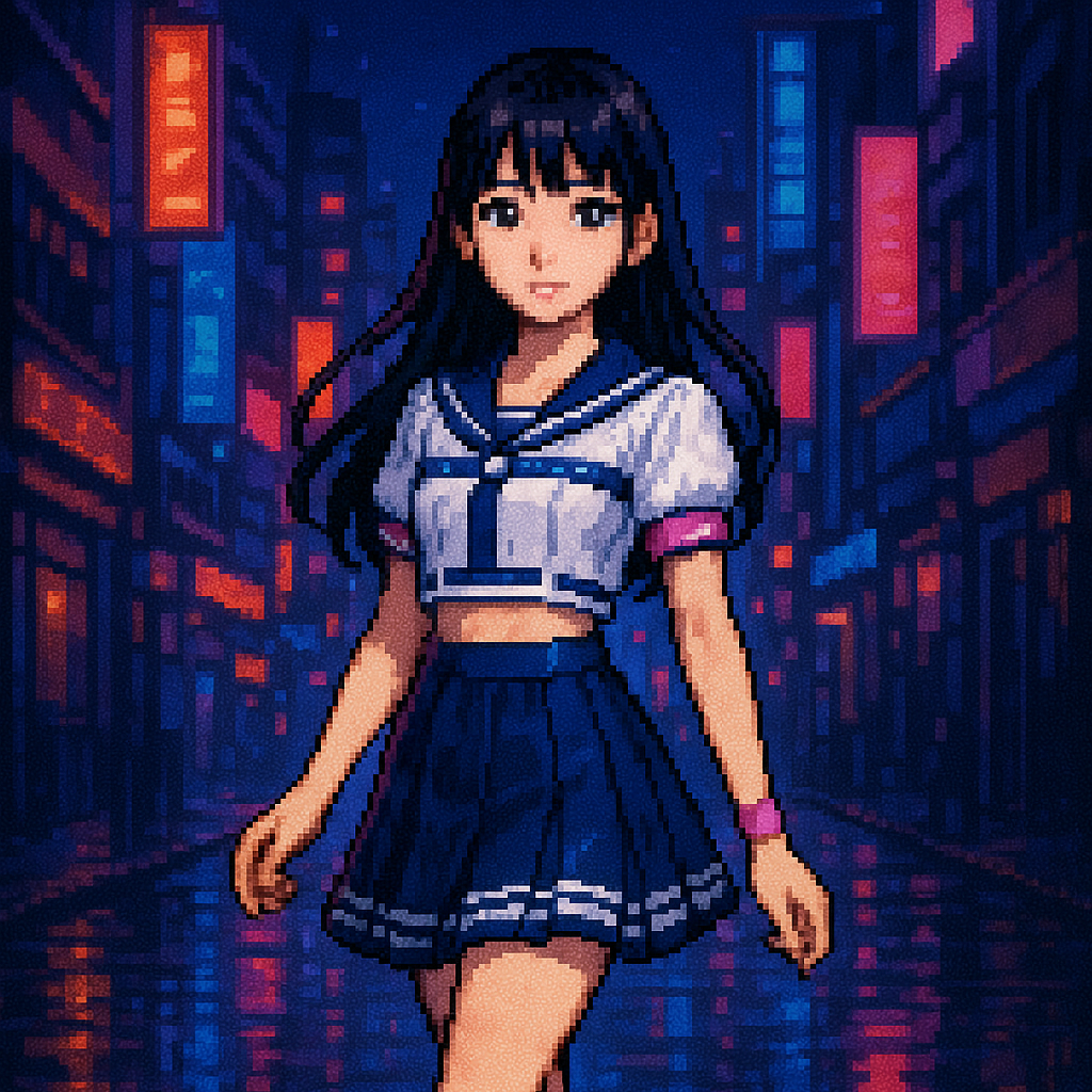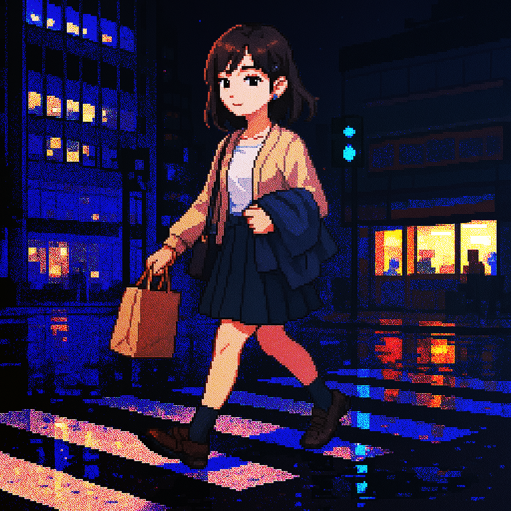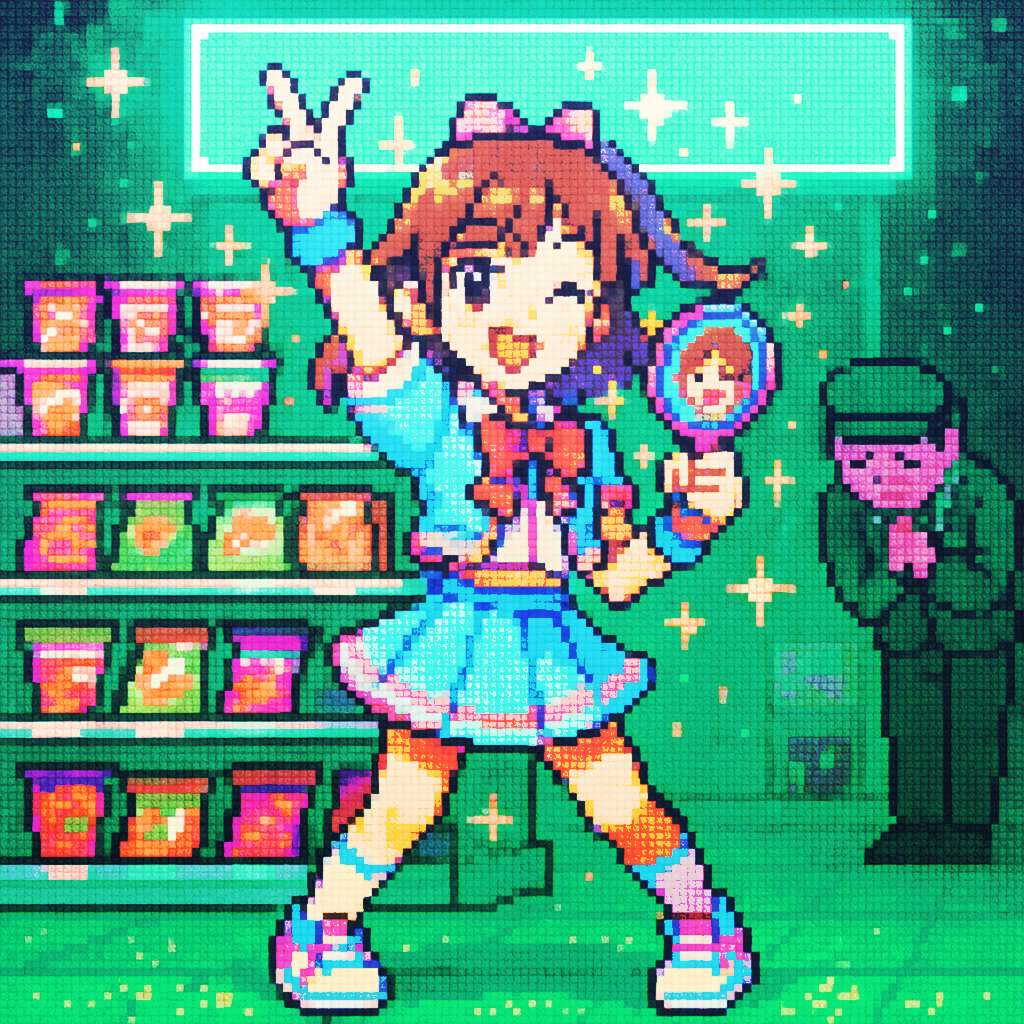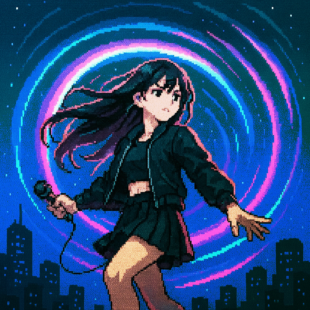 Style: Glossy Japanese kawaii Electro-Pop / Future Disco, 128 BPM, key F♯ min, Drums – four-on-floor kick, crisp snare, bright 16-hat, airy clap, Bass – rubbery syncopated synth bass, octave hops, side-chained, Synths – supersaw chords, glitter 16th arpeggio, FM pluck fills, Lead – pentatonic saw riff with slides; chopped *wordless* vocal shots, FX – reverse cymbal, vinyl down-lifter, bit-crush rise, wide noise, Form
