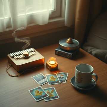 A chill lofi track opens with delicate kalimba patterns layered over vinyl crackle, Warm synth pads glide in, creating a gentle, dreamy atmosphere, Sparse percussion, subtle bass, and soft electric piano lines round out the relaxed groove, cultivating a laid-back vibe