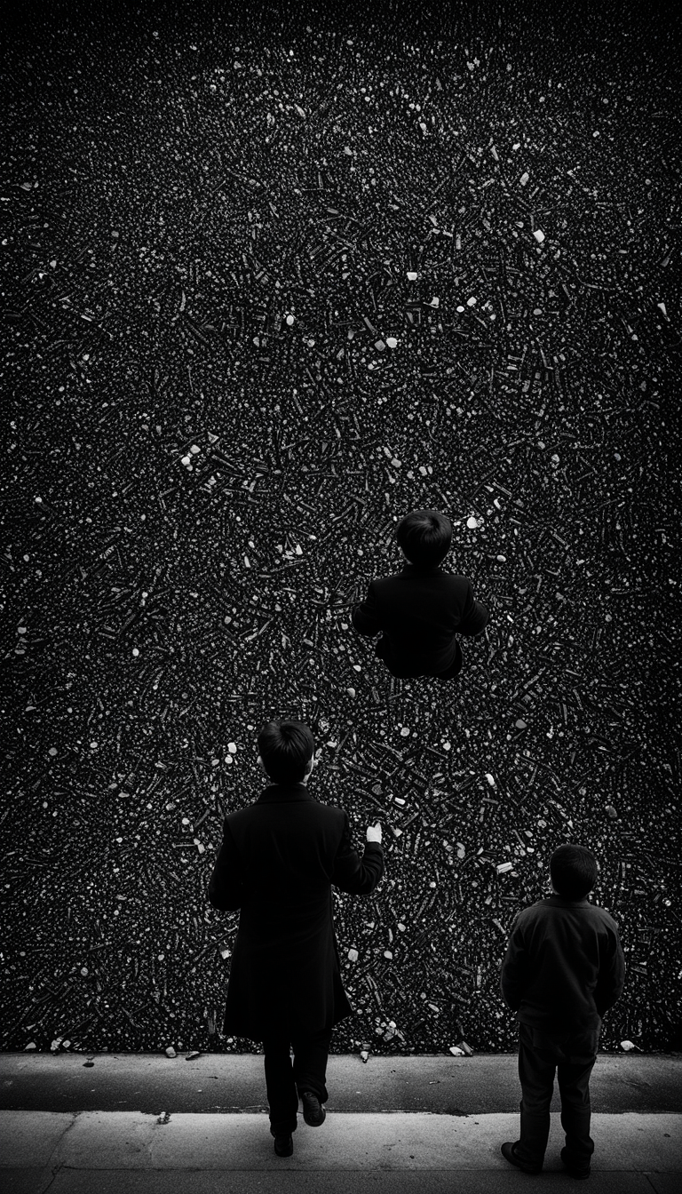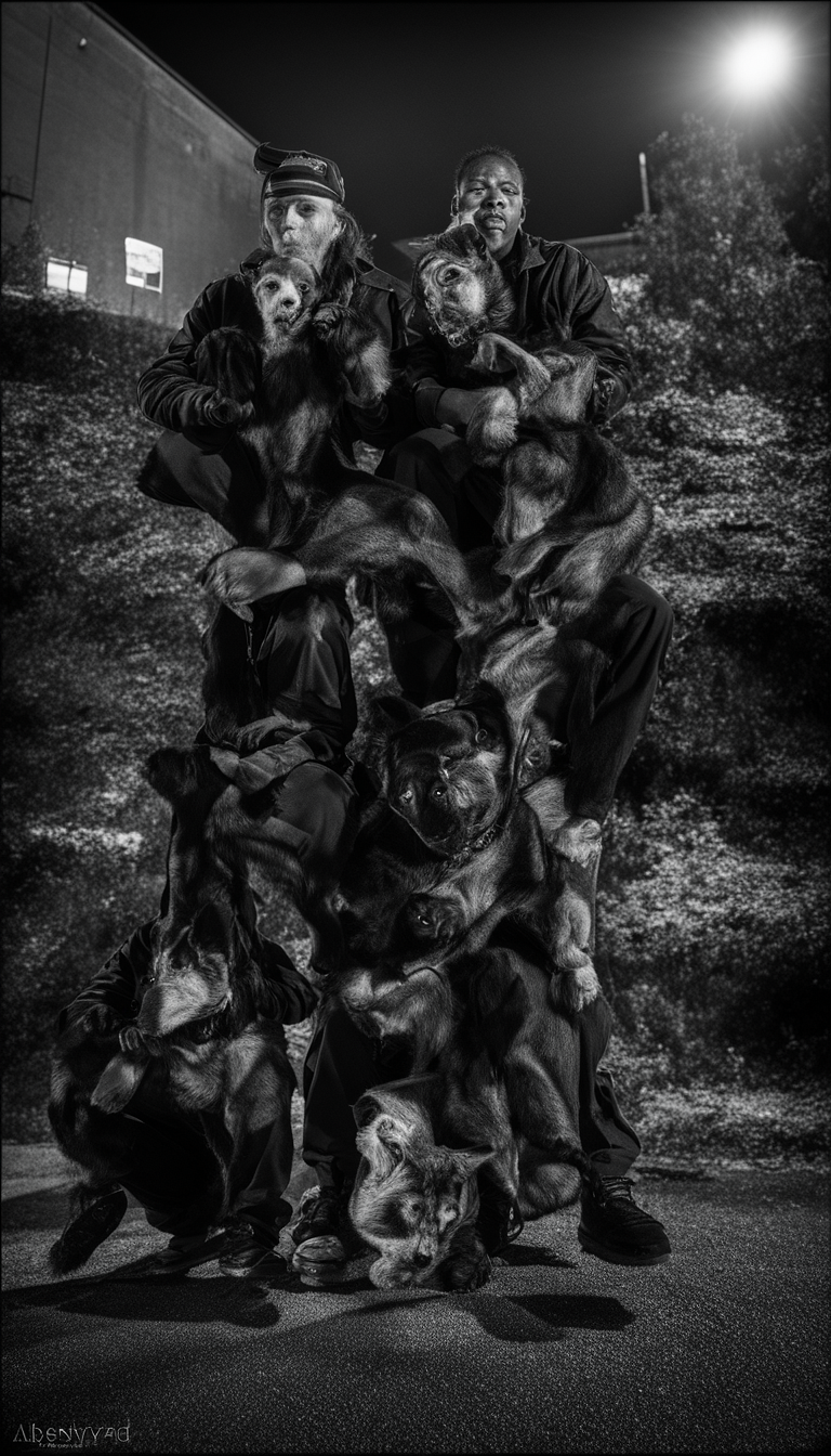 industrial hip-hop, aggressive noise, glitch percussion, distorted vocals, anarchic energy, chaotic sampling, pounding drum machine, digital abrasion, dystopian tension, manic delivery, harsh synth stabs, claustrophobic compression, experimental rap, rhythmic violence, cyberpunk atmosphere, primal shouting, fractured beats, confrontational tone, crunchy production, distorted bass, ruined equipment, shuffling 2-step rhythm, lush orchestral background