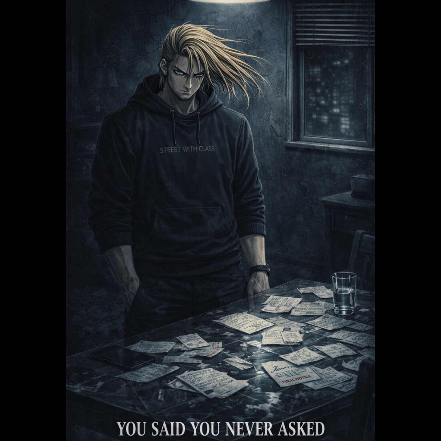 INTENT: Track 6 confronts the excuse “you never asked, ” exposing how implied need, accepted help, and silent permission were later twisted into denial, STYLE: emotional modern rap with cold trap drums, tense piano, low synth pressure, and dark late-night atmosphere, VOCALS: male rap only, direct, bitter, controlled, clear diction, no singing, INSTRUMENTATION: stark piano motif, deep sub bass, punchy kick, crisp snare, sparse hats, subtle ambient texture, light reverse swells, ARRANGEMENT: intro minimal, verses tight and accusatory, pre-hook tense, hook wider and heavier, bridge stripped then rebuilding, final hook full, outro direct, TEMPO: 90 BPM, MOOD: bitter, sharp, betrayed, resolved, PRODUCTION NOTES: keep space for dense lyric clarity, no filler ad-libs, no long tail, hard stop immediately after the final outro line