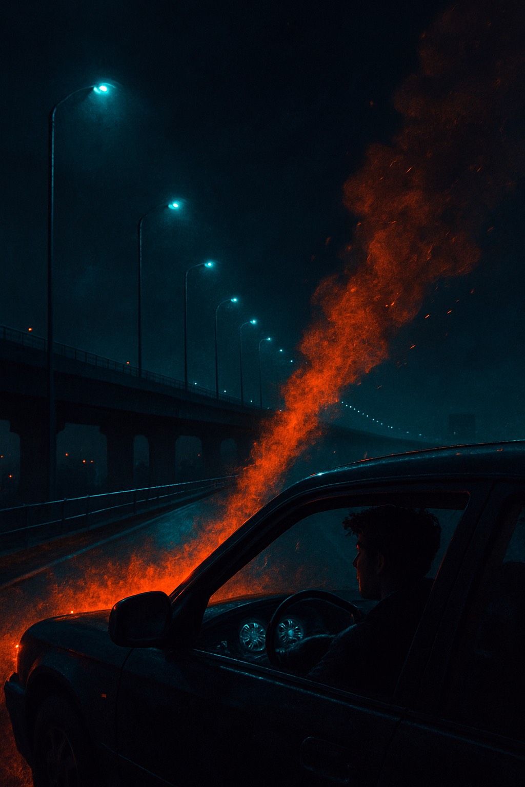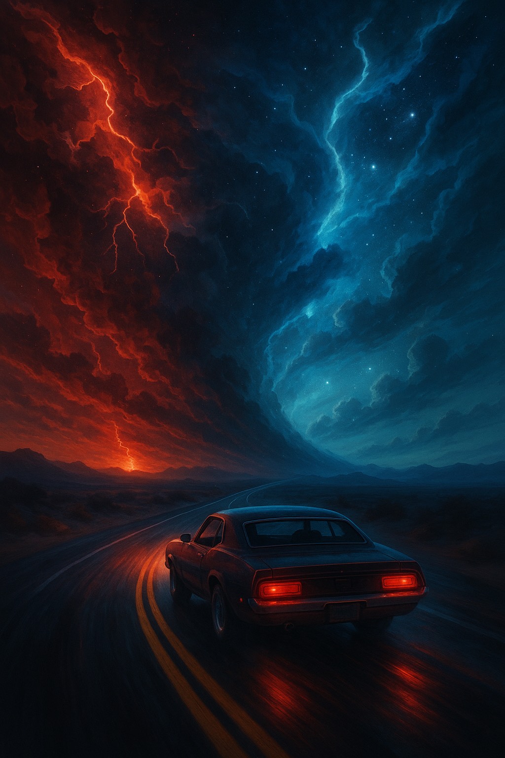 Energetic electronic emo rock, edgy and emotional, erupting with evolving synths and echoing electric guitars, energetic male vocal, epic dynamic build, enveloping reverb, emphasized rhythm and extended endings, euphoric yet existential nighttime freeway energy